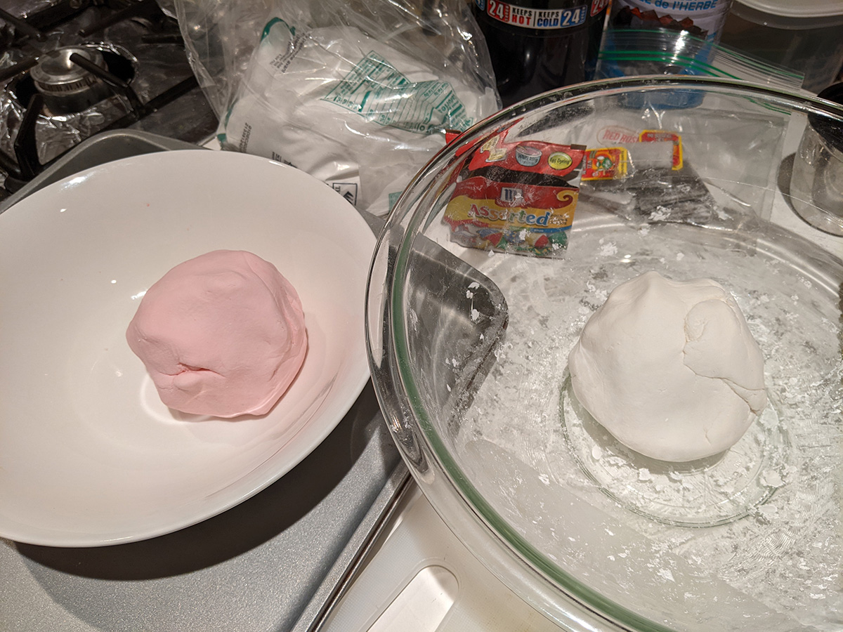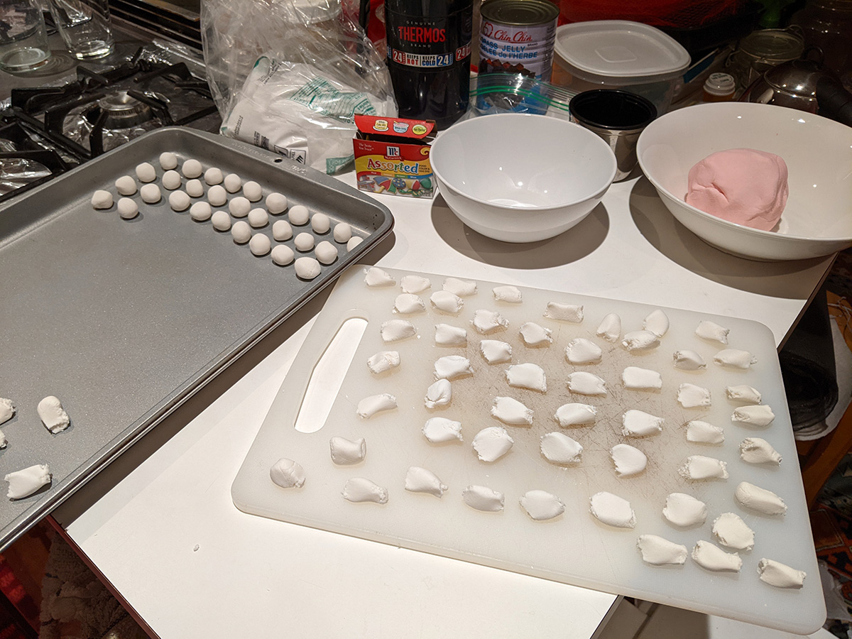 around 9pm i started making some glutinous rice balls. i used up the entirety of an old package of glutinous rice flour - around 360g - to make the dough. instead of measuring the water, i just added enough water while mixing the flour until it formed into a dough. i also did the trick where i cooked a tiny amount of dough and then added it to the rest of the dough, to make it more elastic. i then started dividing the dough into nuggets and rolling them into the balls. it took a while, and the dough was starting to dry up as i worked, i definitely need to cover up the dough next time to prevent drying. but the whole process from beginning to end took nearly an hour, i put the rice balls in the freezer to freeze them before putting them into containers.