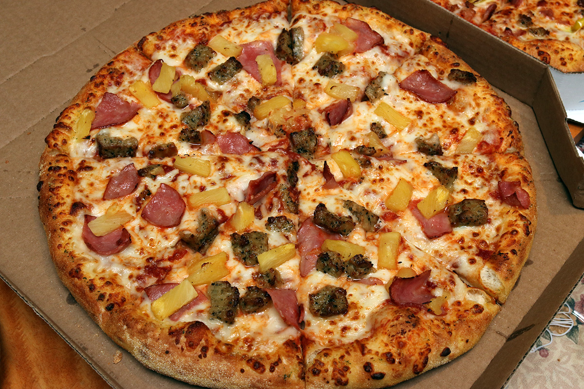 so in the end we decided to do domino's. the only really good pizza at domino's is their everything extravaganzza, but we usually get their $7.99 3-toppings large pizza carryout deal. my mother always insists on getting hawaiian pizza, while i like a combination of meats, garlic/onion, and spicy peppers. my father and i went to go pick up the pizzas, i ended up eating 4 slices.