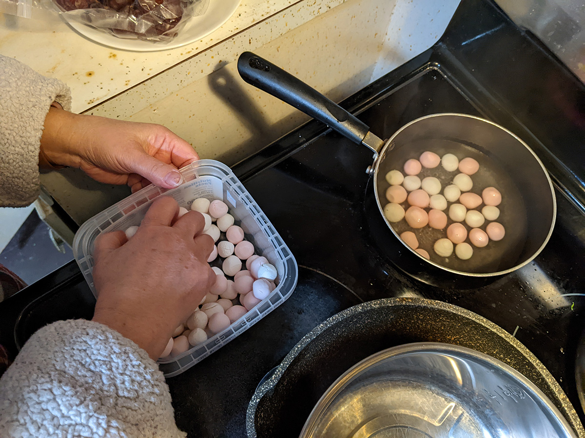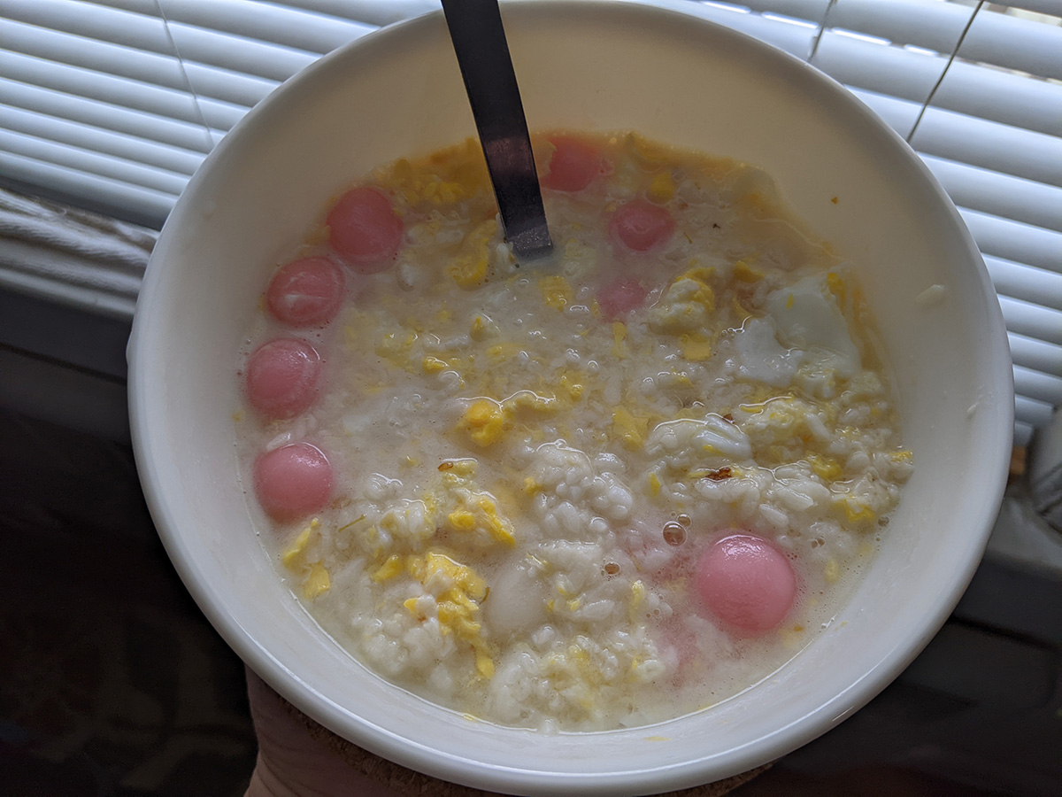 i brought some of the glutinous rice balls i slaved away last night making, and my mother made some jiuniang for breakast-lunch, with eggs i bought, using my fermented sweet rice, with some osmanthus syrup.