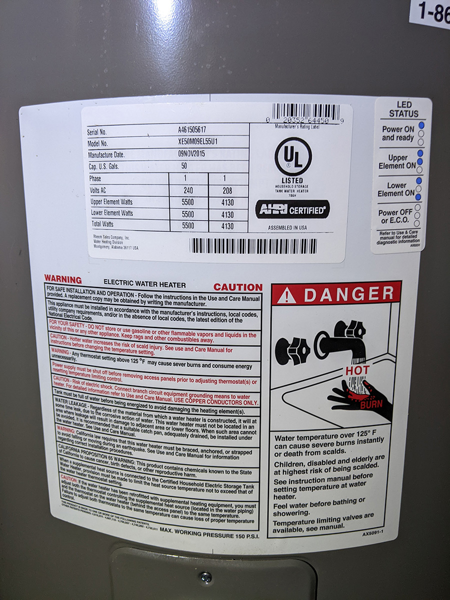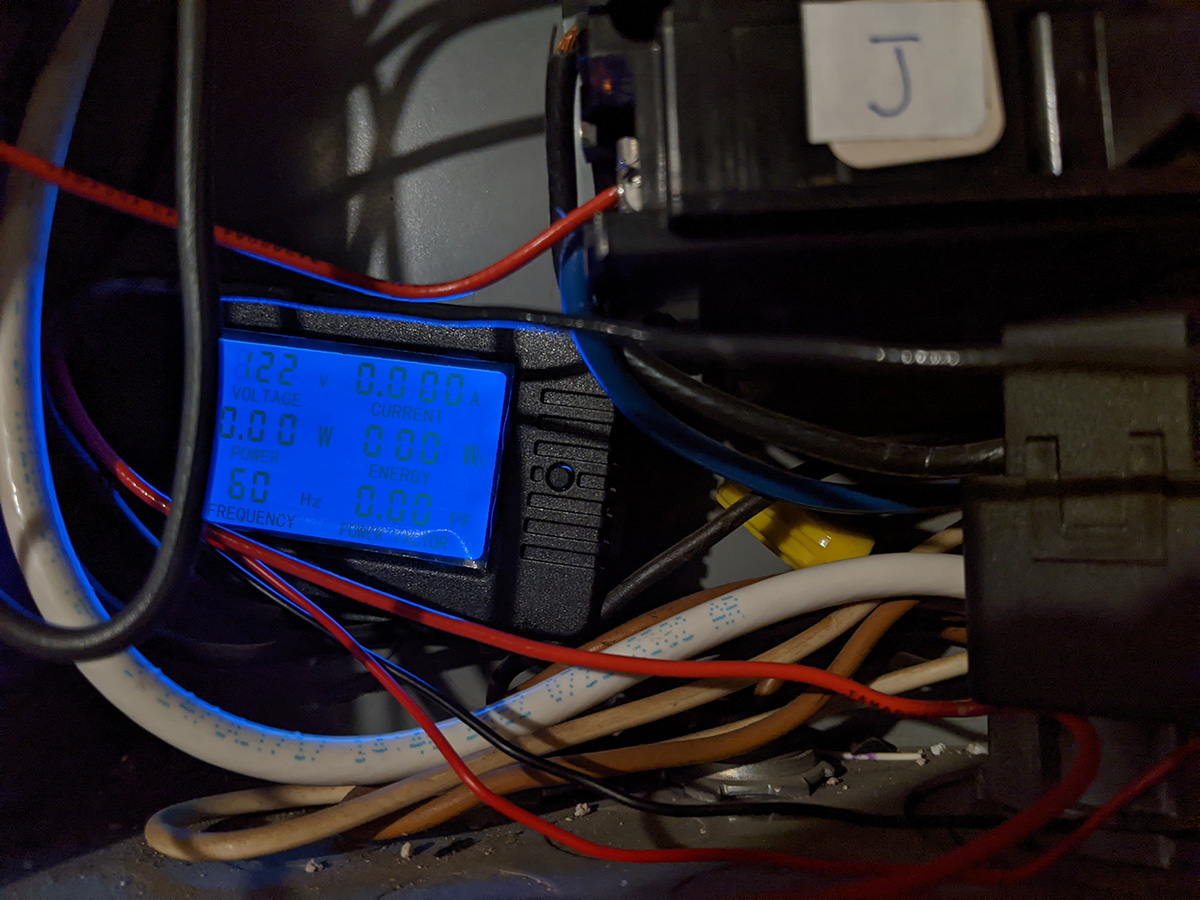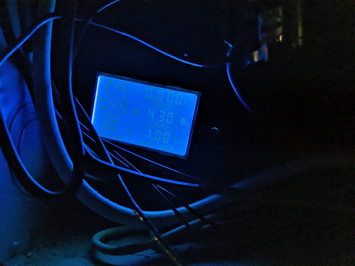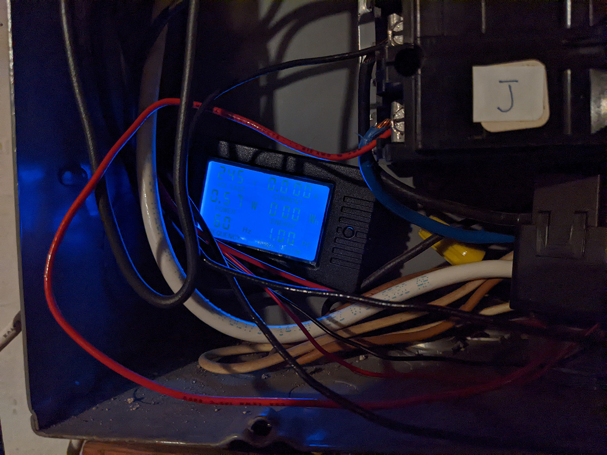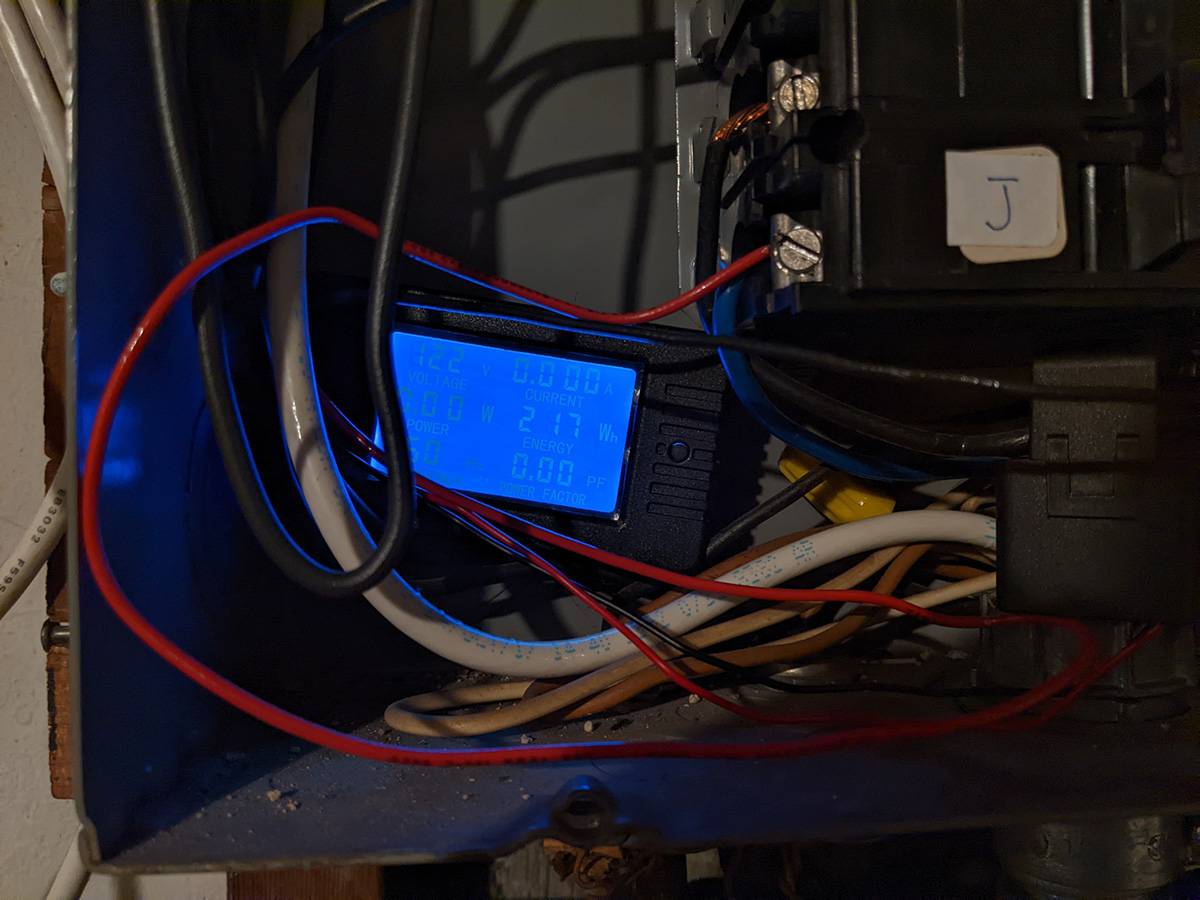 before i returned home, i thought about our new energy meter, and something didn't seem right. the hot water tank uses 240v, so therefore it uses a 240v circuit breaker. but how come the meter only read 120v? we weren't getting a full reading. so we went back to the basement, and instead of connecting the neutral wire to the neutral terminal block, we attached it to the other contact point of the 240v circuit breaker. not only did our meter now read 240v, but the power factor was now 1.0 when it was zero before. we just need to wait for the hot water heater to heat up again to see how much electricity it uses. and actually, right before i left, i went down to the basement one last time and saw that there was a new energy reading of 430Wh. so when the hot water tank is heating, it's not using 217Wh, it's actually using twice that amount, 430Wh.