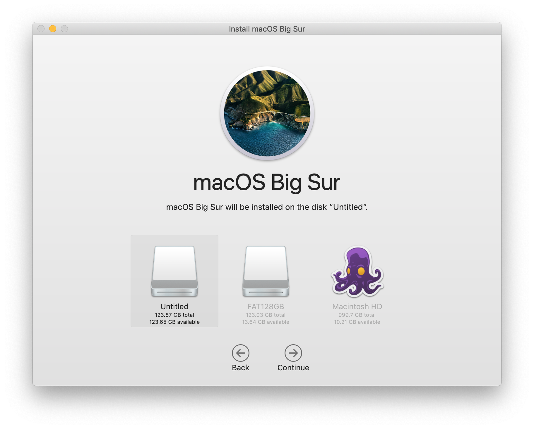 in order to use the 2022 edition of turbotax, i needed to install a more recent macos onto a thumb drive so i can run turbotax off of the thumb drive. my late 2013 15-inch retina macbook pro can handle big sur, so that's what i downloaded. i then went ahead and installed it onto the thumb drive. this took a few tries. first time i just created a big sur installer, which wasn't what i wanted. i then installed big sur directly onto the thumb drive (selecting the thumb drive as the target), but when it came time to restarting from the drive, it would never boot up. i then recreated a bootable big sur installer onto the drive, booted from the drive, then tried to self-install on itself, but that didn't work.