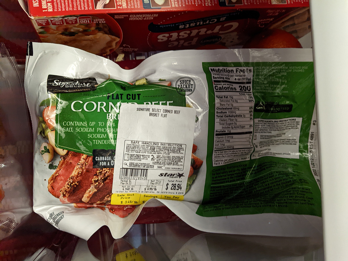 after some cereal for lunch, i went across the street to star market to get some corned beef on sale. star market's price is actually cheaper ($2.50/lbs for point cut, $3.50/lbs for flat cut) than market basket