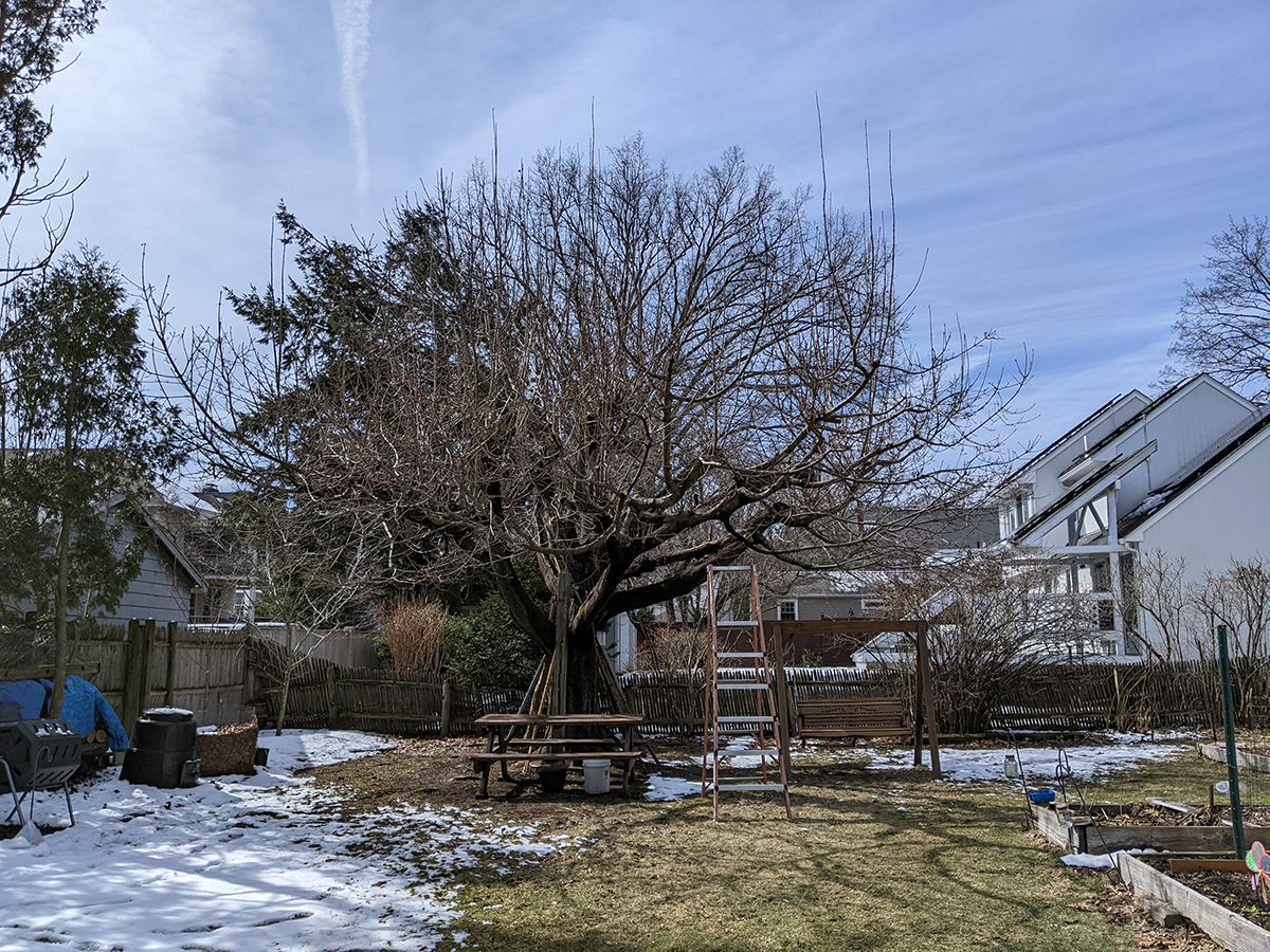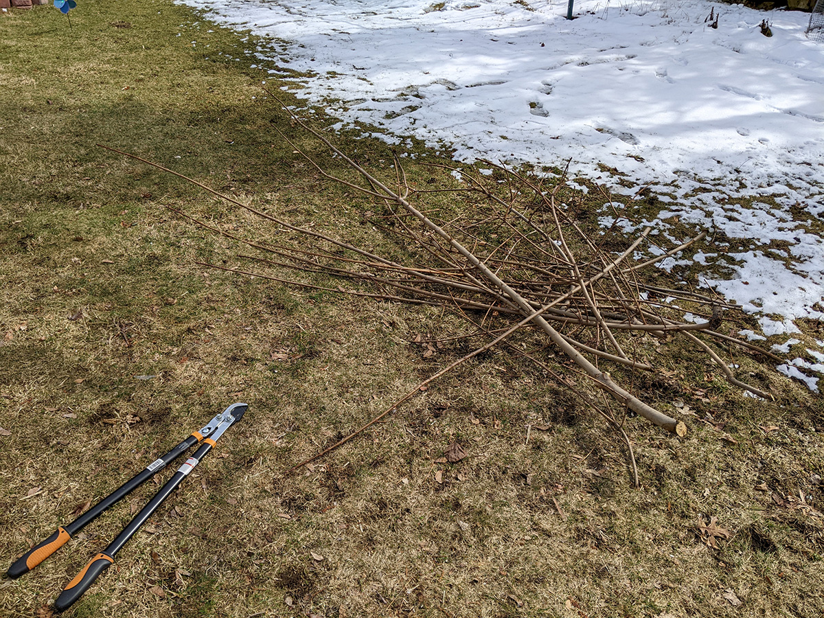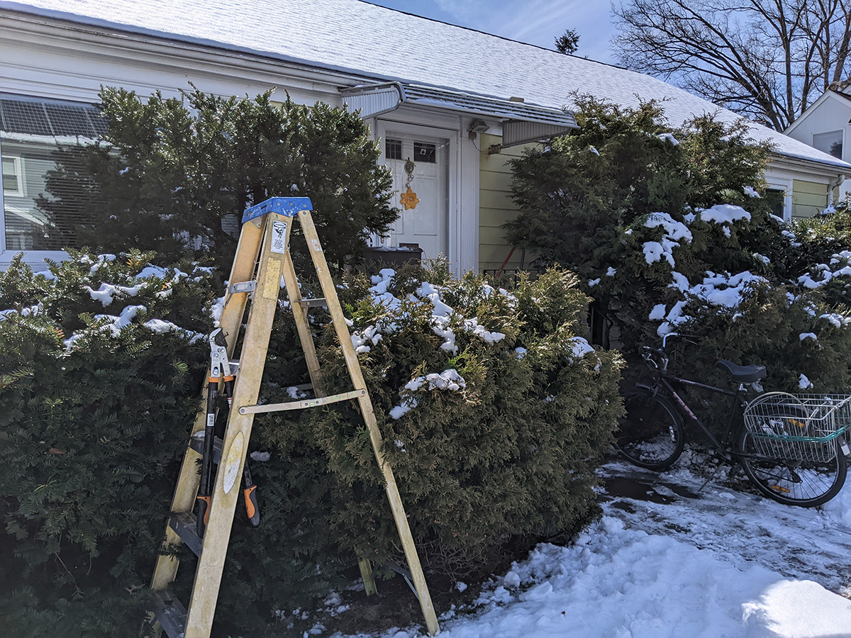 afterwards i did some pruning: an evergreen in front of the house that was growing so tall it was blocking the living room window, and some suckers from the backyard maple tree. the maple tree was dripping sap from the branches that i cut, which means once again i've prune a little late but nothing i can do about it. best time to prune trees is at the end of winter but before it starts getting warm enough for the sap to drip.