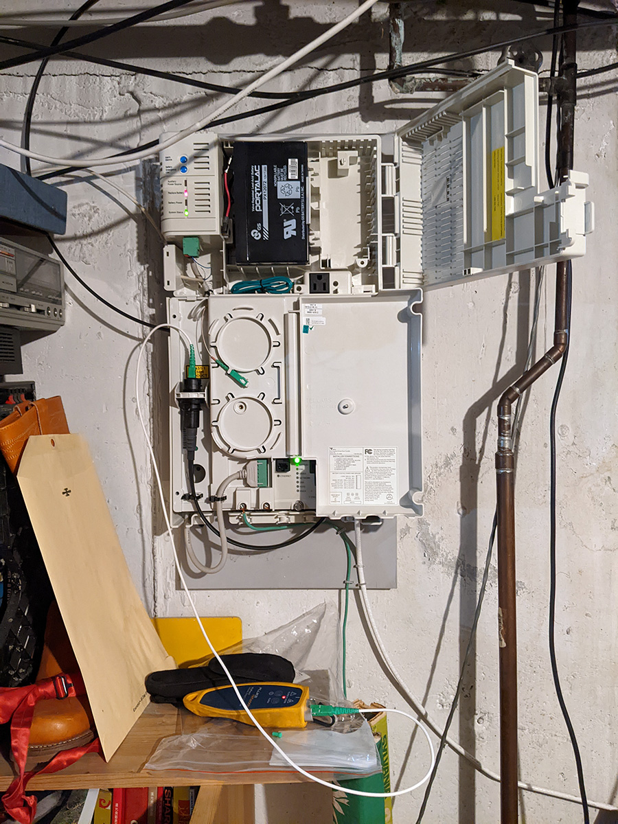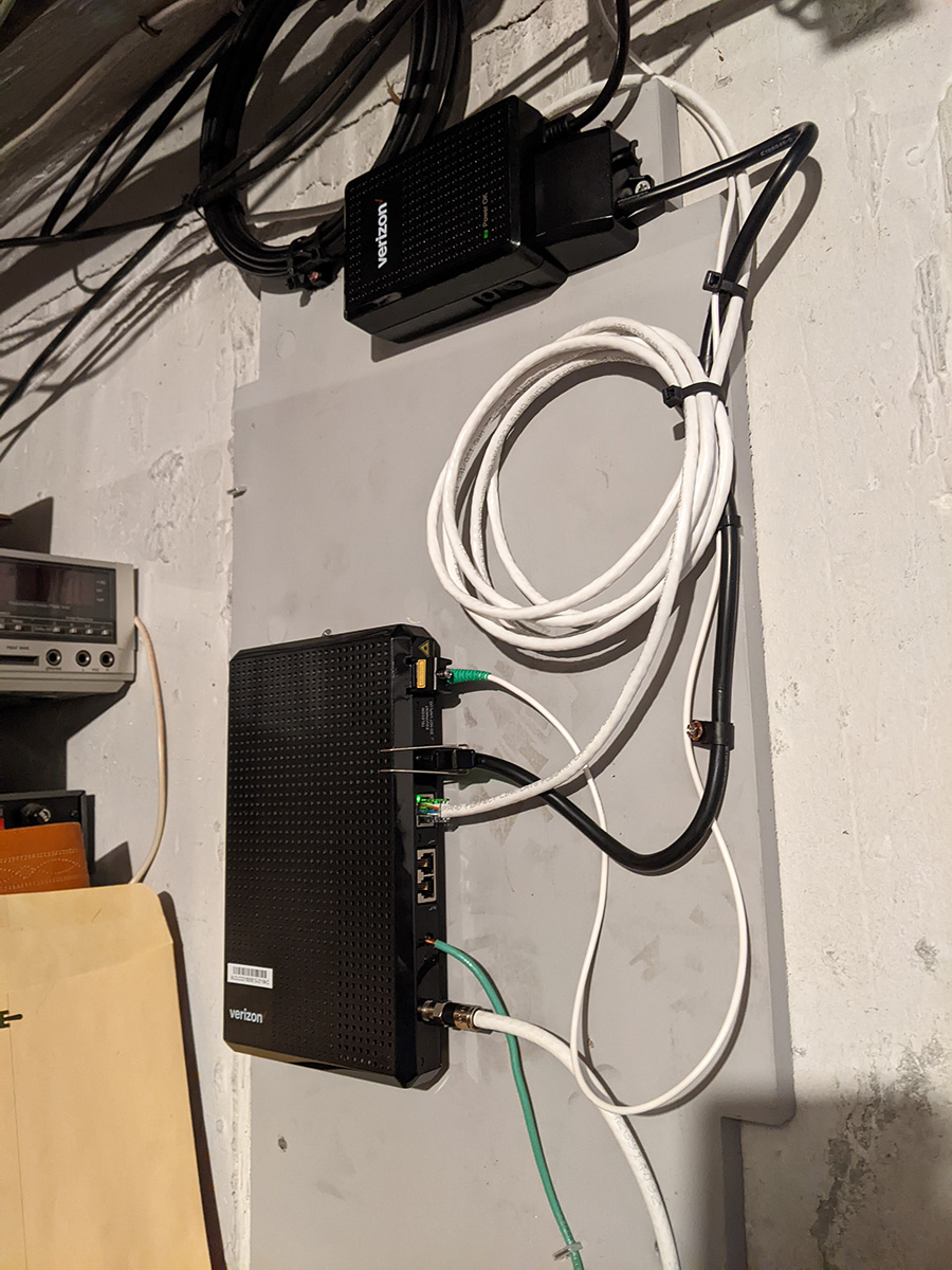 the verizon technician was named jim. he put on some booties before coming into the house so he wouldn't track his wet shoes everywhere. verizon informed me multiple times (via text and e-mail) that i had to wear a mask and social distance, but jim arrived maskless. in one hand he had a bag of tools, in the other a tote bag with some verizon equipment. he was replacing the verizon fiber-optic box in the basement, which is old enough i can't remember exactly when it was installed (late 90's if i had to guess). these things are called "ONT" which stands for "optical network terminal". the new ones are tiny and look more like a typical cablemodem than the old-style ONT. jim opened up the old ONT and hooked up some device to the end of the fiber-optic cable coming into the house. then he went out to do something to the switch box which apparently is located a few blocks away.