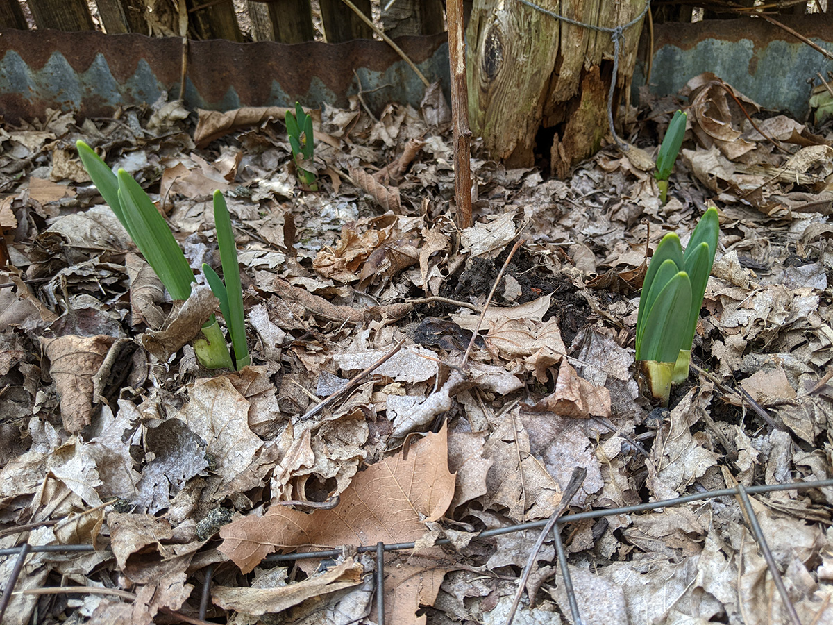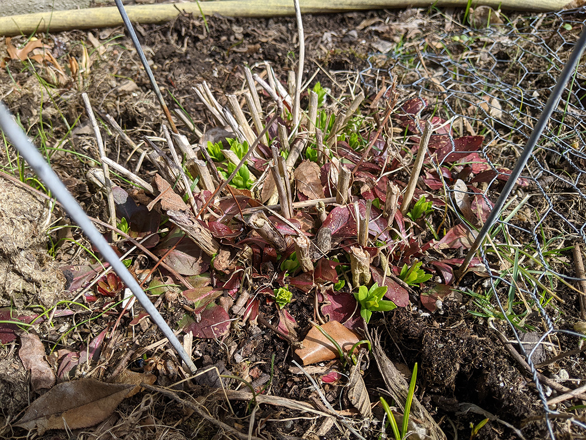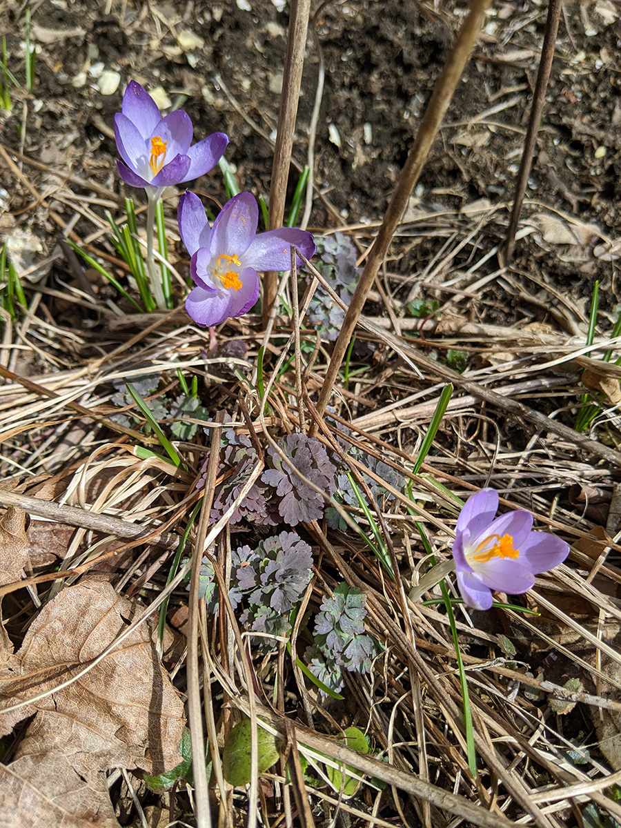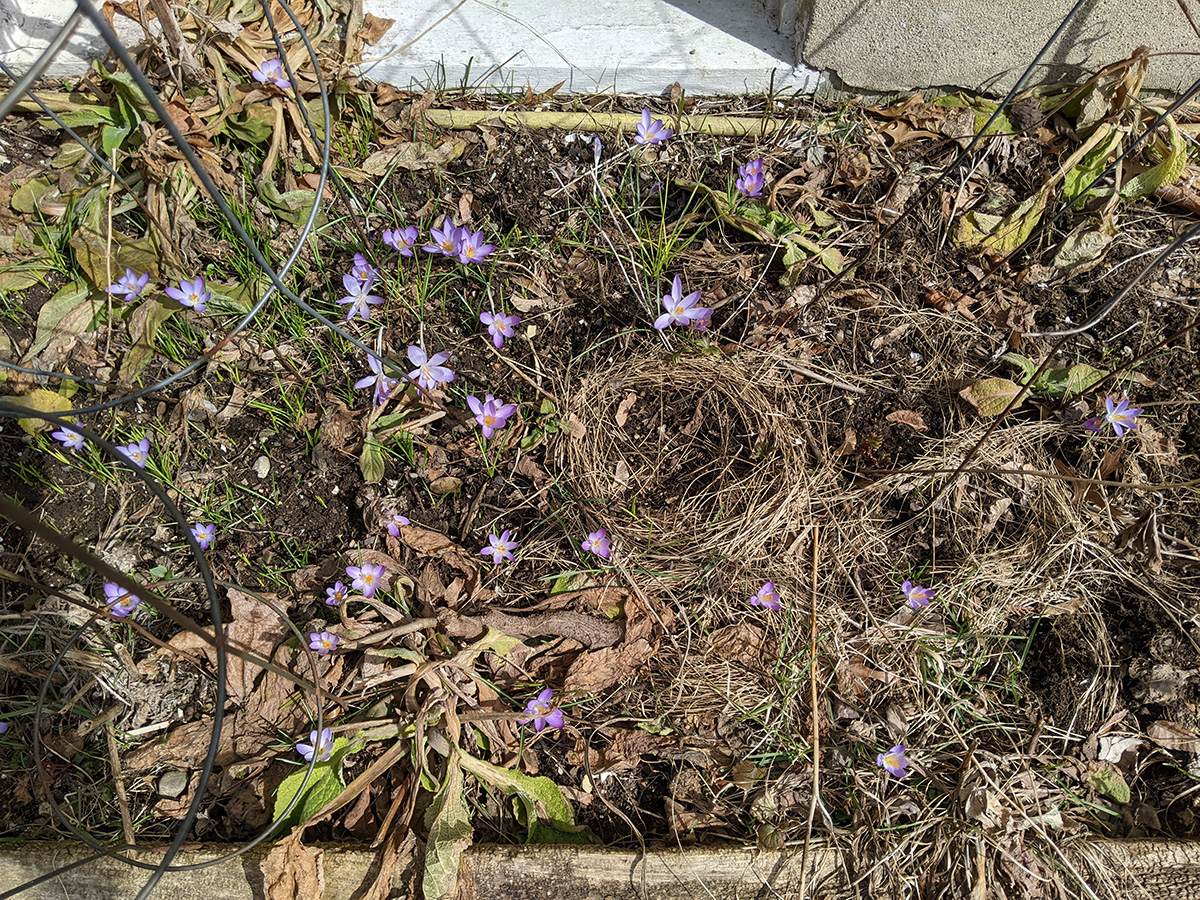 i was done with the second branch pile by 1:30pm, used up all the available garden refuse containers we have. i did a tour of the backyard to see what was emerging. more and more crocuses are appearing in the western perennial bed. i use the crocuses to gauge if there are any rabbits in the backyard, because rabbits love to eat these flowers. if the are intact, it means no rabbits.