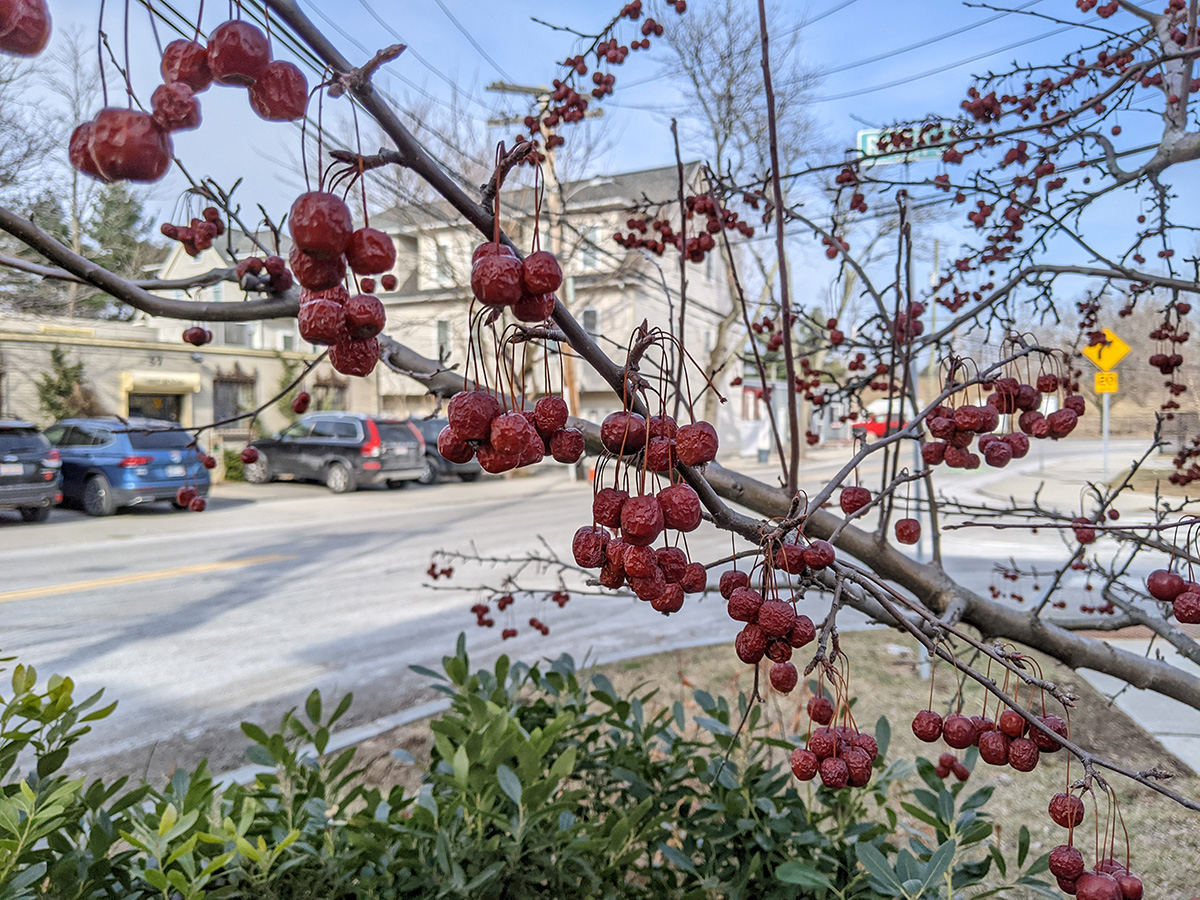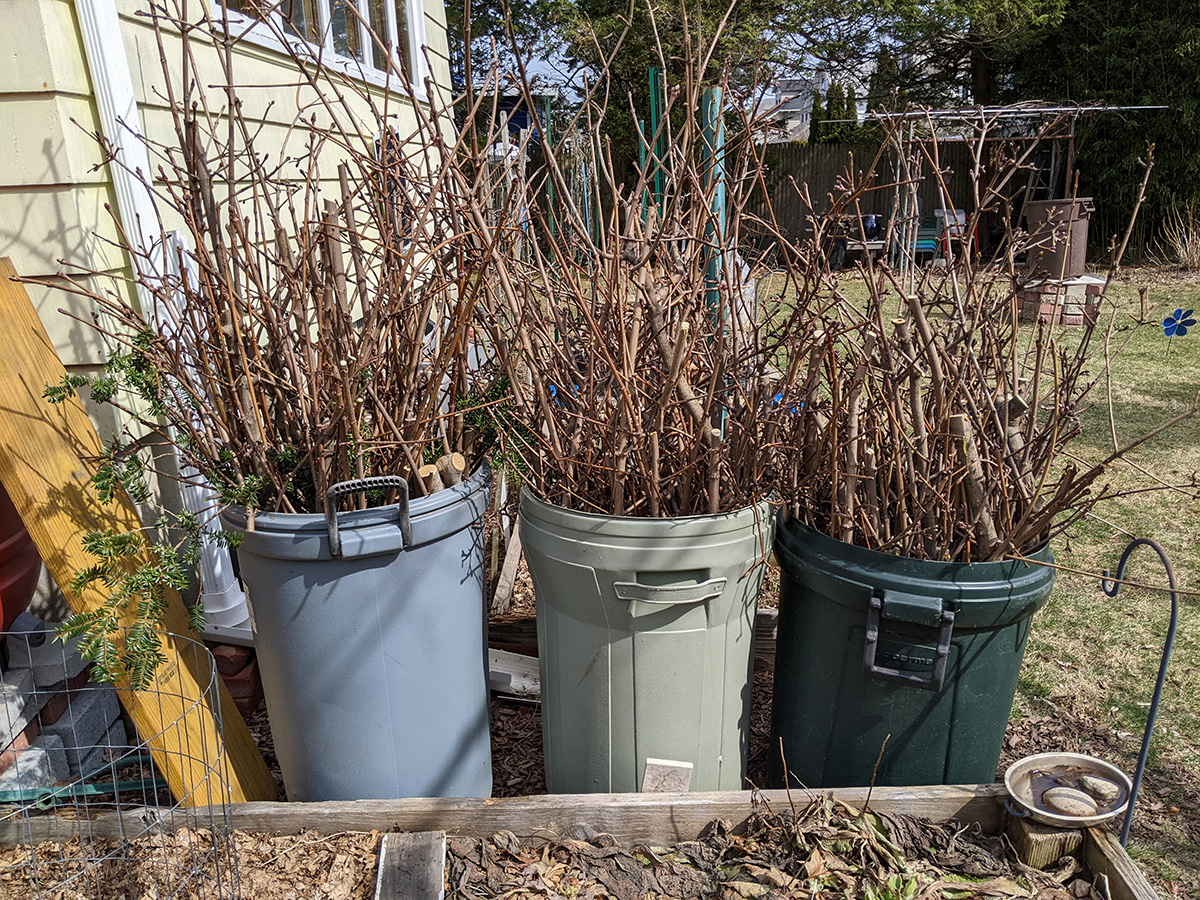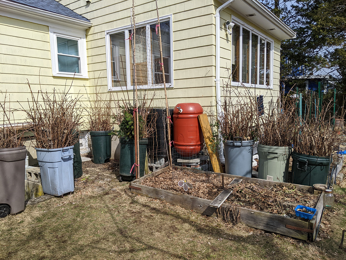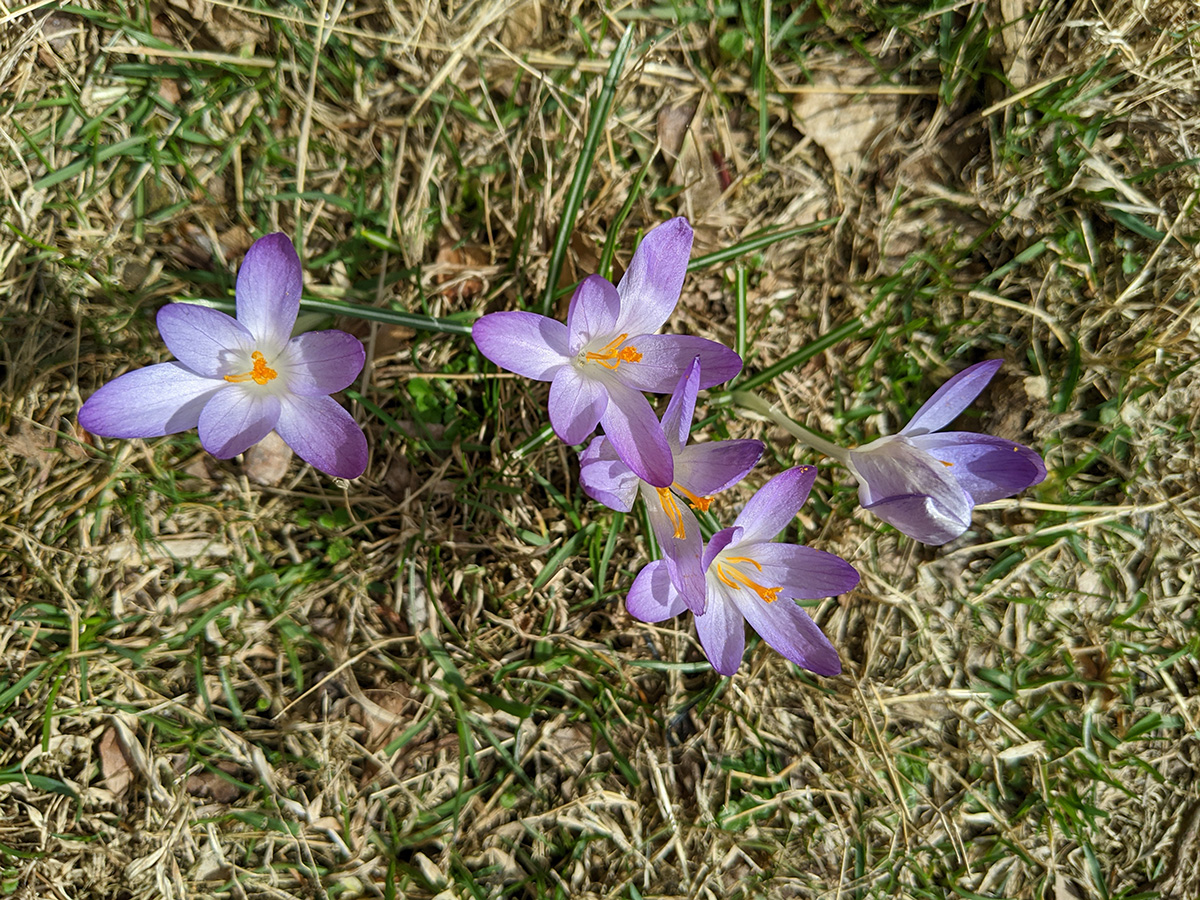 i was done with the second branch pile by 1:30pm, used up all the available garden refuse containers we have. i did a tour of the backyard to see what was emerging. more and more crocuses are appearing in the western perennial bed. i use the crocuses to gauge if there are any rabbits in the backyard, because rabbits love to eat these flowers. if the are intact, it means no rabbits.