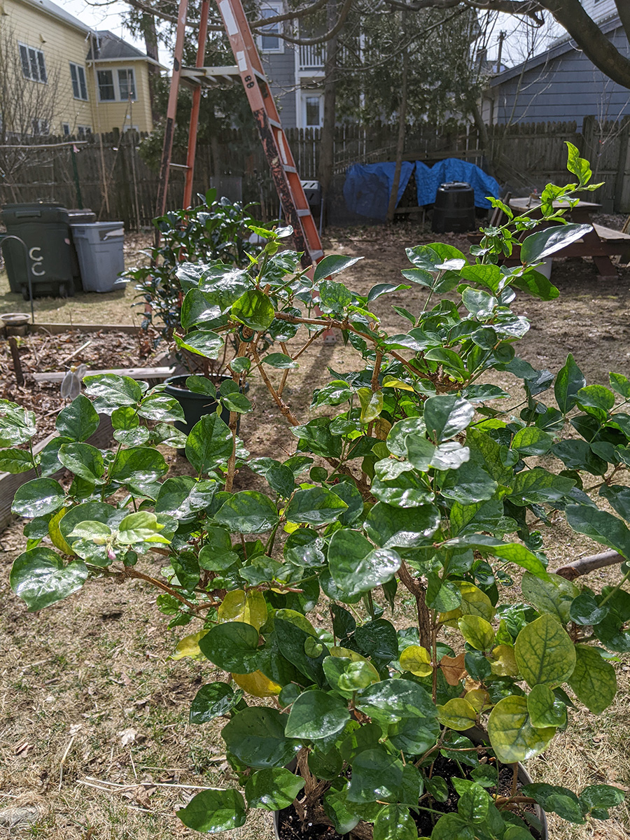 i got there a bit before 11am and starting pruning one of the two branch piles in the backyard. it was warm enough that i worked in just a t-shirt, which is unusual, since typical temperature this time of the year should be in the 40's. at one point i stopped and brought out some houseplants from the basement grow room so i could spray them down with neem oil. even with that interlude, i managed to clear one of the branch piles before heading inside by noontime to get some lunch and watch the news.