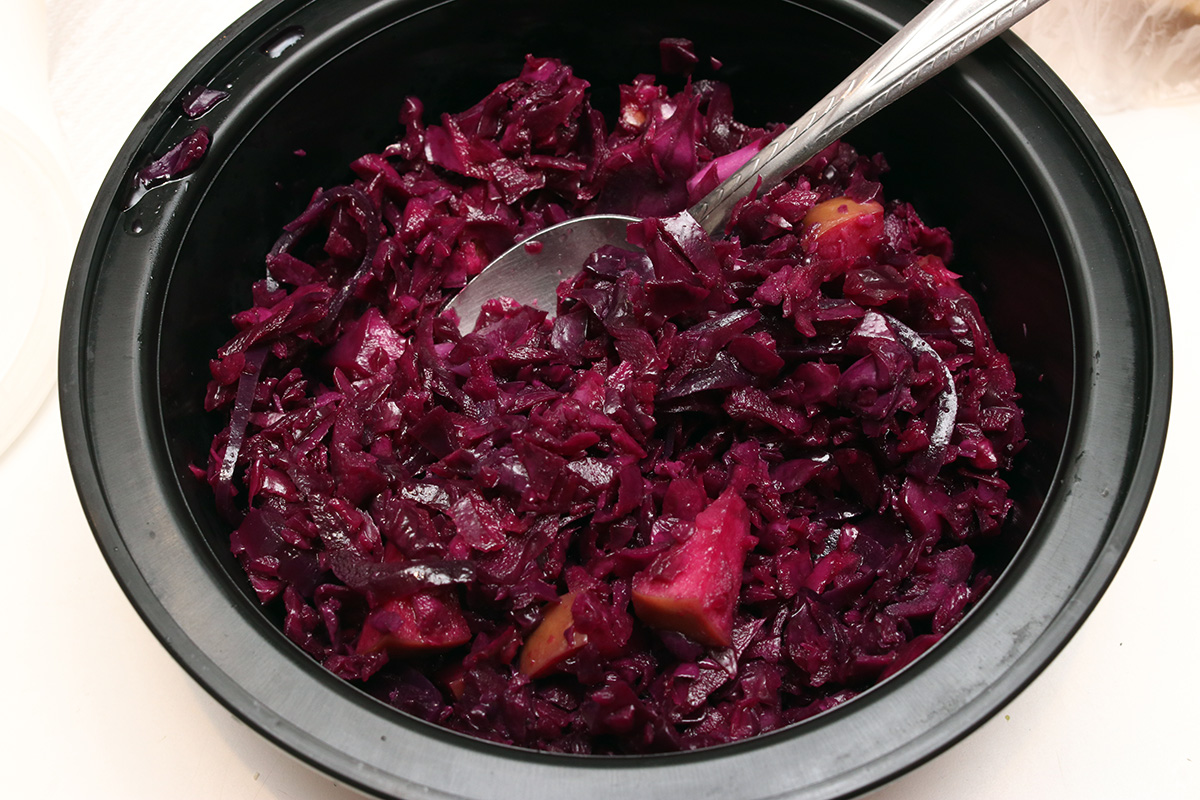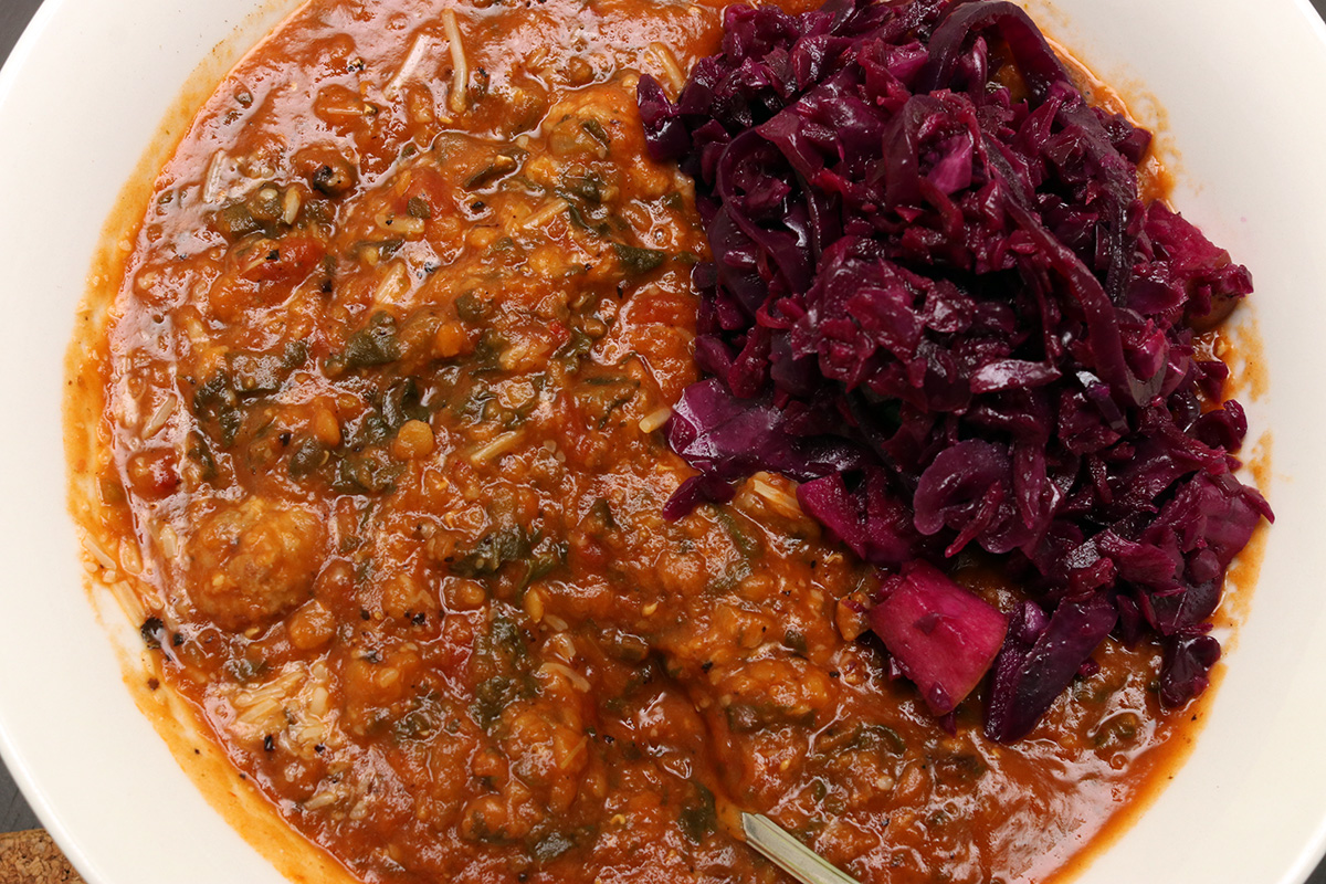 for dinner i reheated some leftover sausage kale lentil soup and had some red cabbage slaw. bruce recommended i add some vinegar, so i mixed in a dash of red wine vinegar. it made the slaw tangy and sweet, with a nice crunch that complemented the mushiness of the lentil soup.
