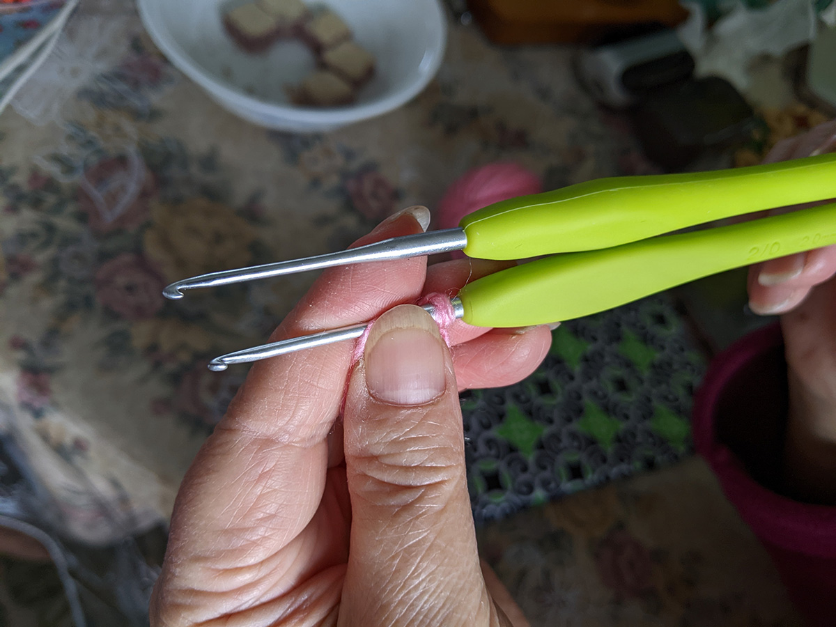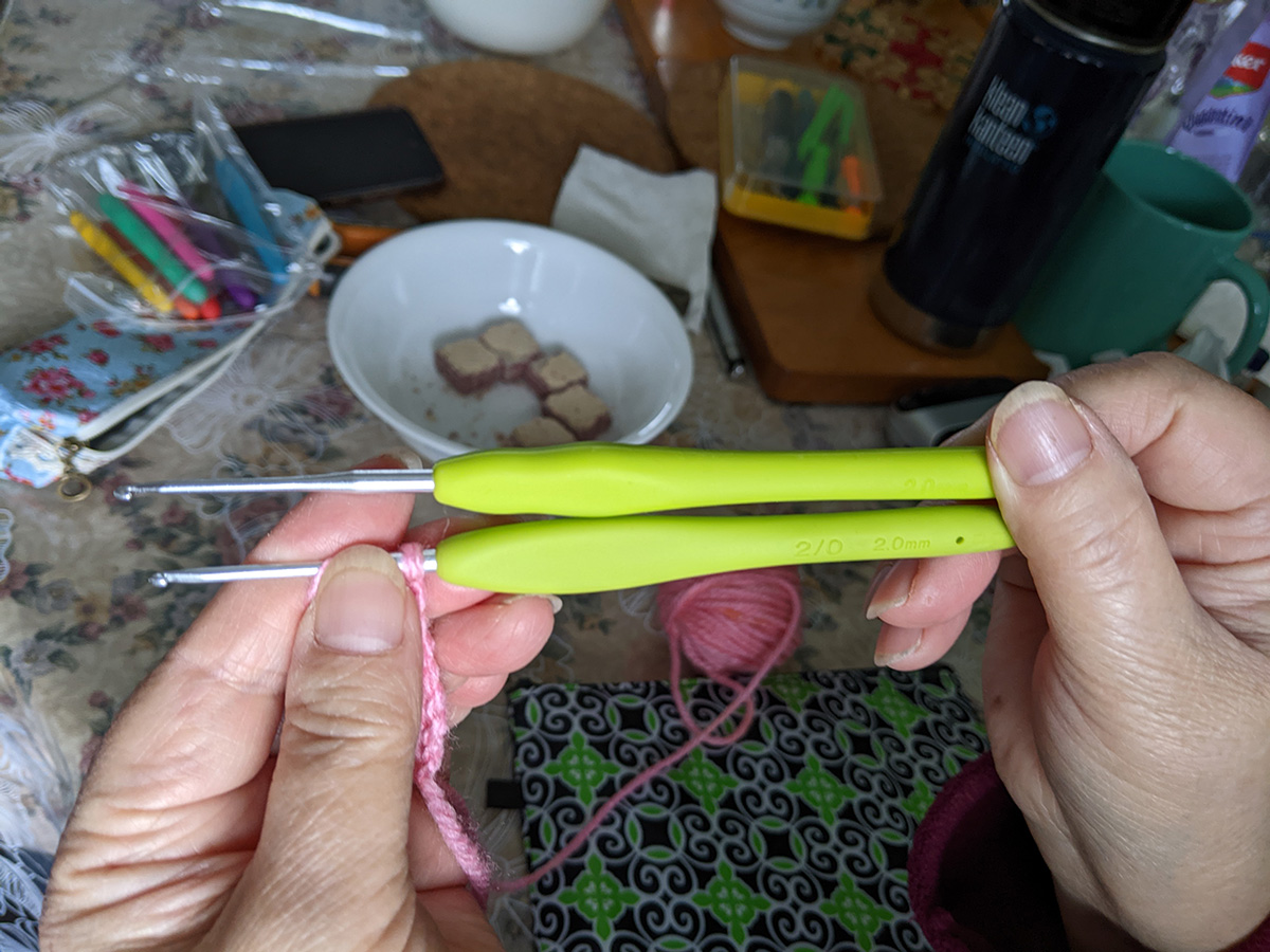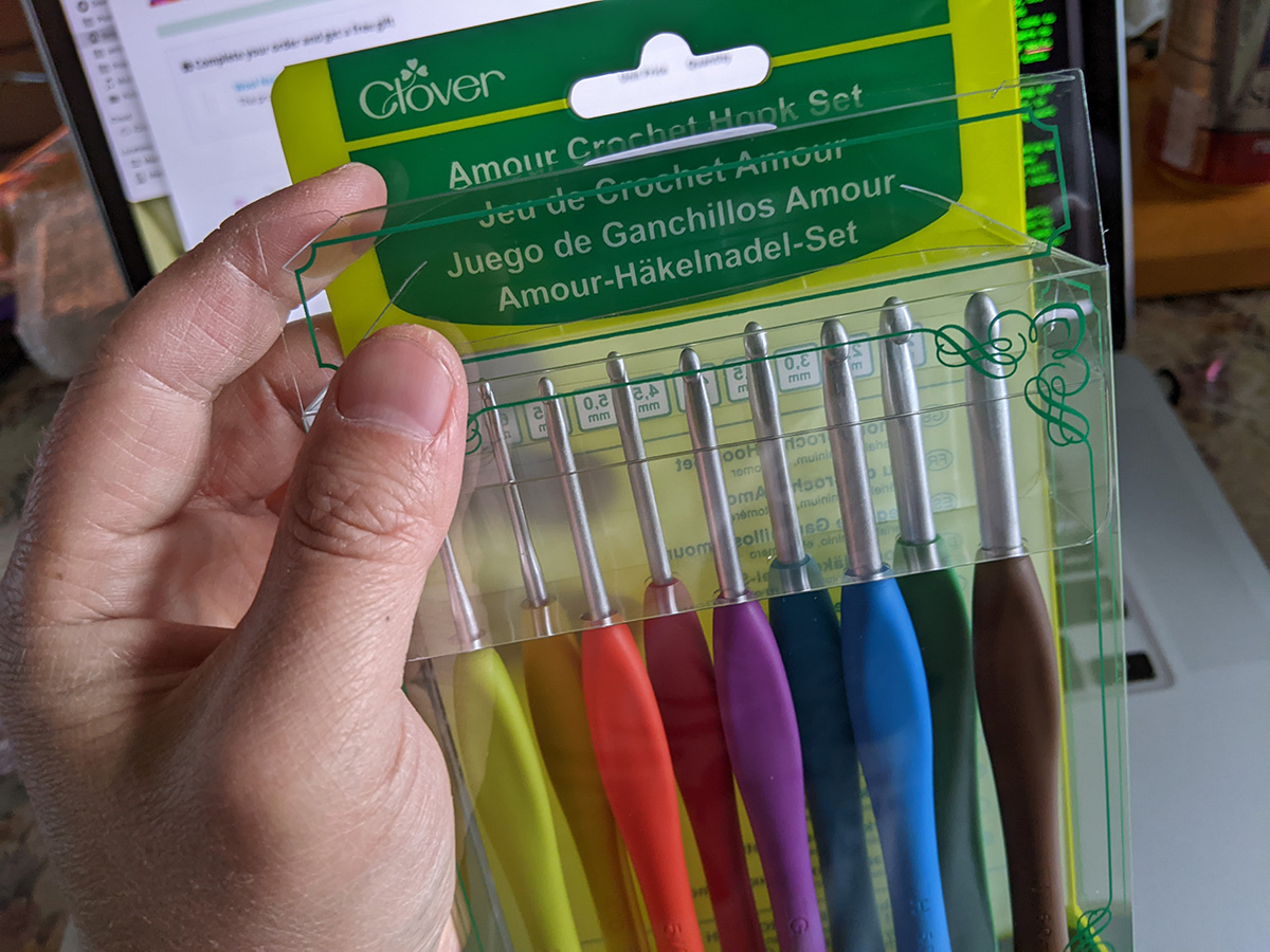 my mother's new clover amour crochet hooks arrived today. she liked them right away, and even though i couldn't really tell the difference between the clovers and the chinese knockoffs, my mother said the clovers were much better, and decided to keep them. not only that, but she thinks they're just as good as the tulip-brand crochet hooks, and she likes that they're only half the price. she decided to take all the small sized hooks (2mm, 2.5mm, 3mm, 3.5mm, 4mm) with her to taiwan, leaving behind the larger hooks.
