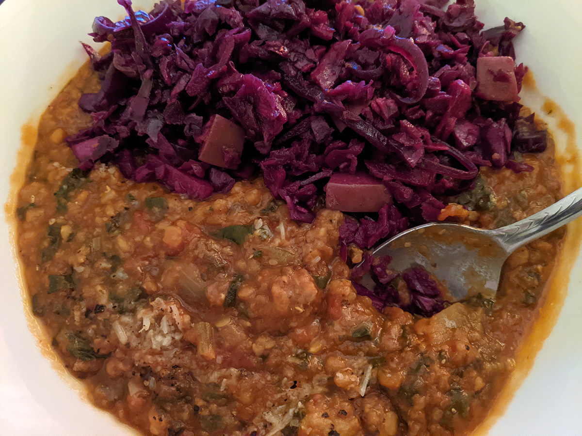 for dinner i finished the rest of bruce's purple cabbage slaw along with some more sausage kale lentil soup.