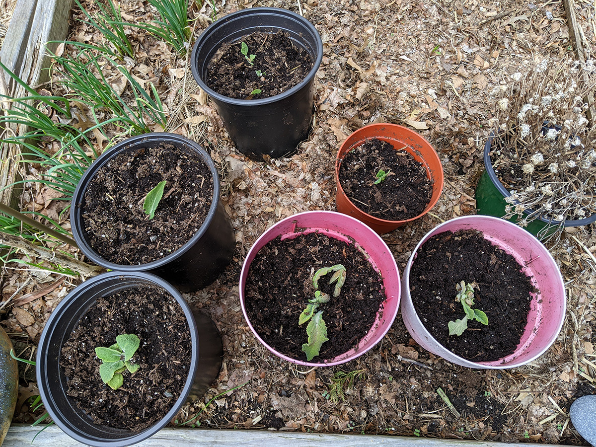 my father dug out some errant foxgloves growing in random places around the backyard. he plans on planting them around the cafe. i put a wire screen over them so squirrels won't be tempted to dig in the pots.