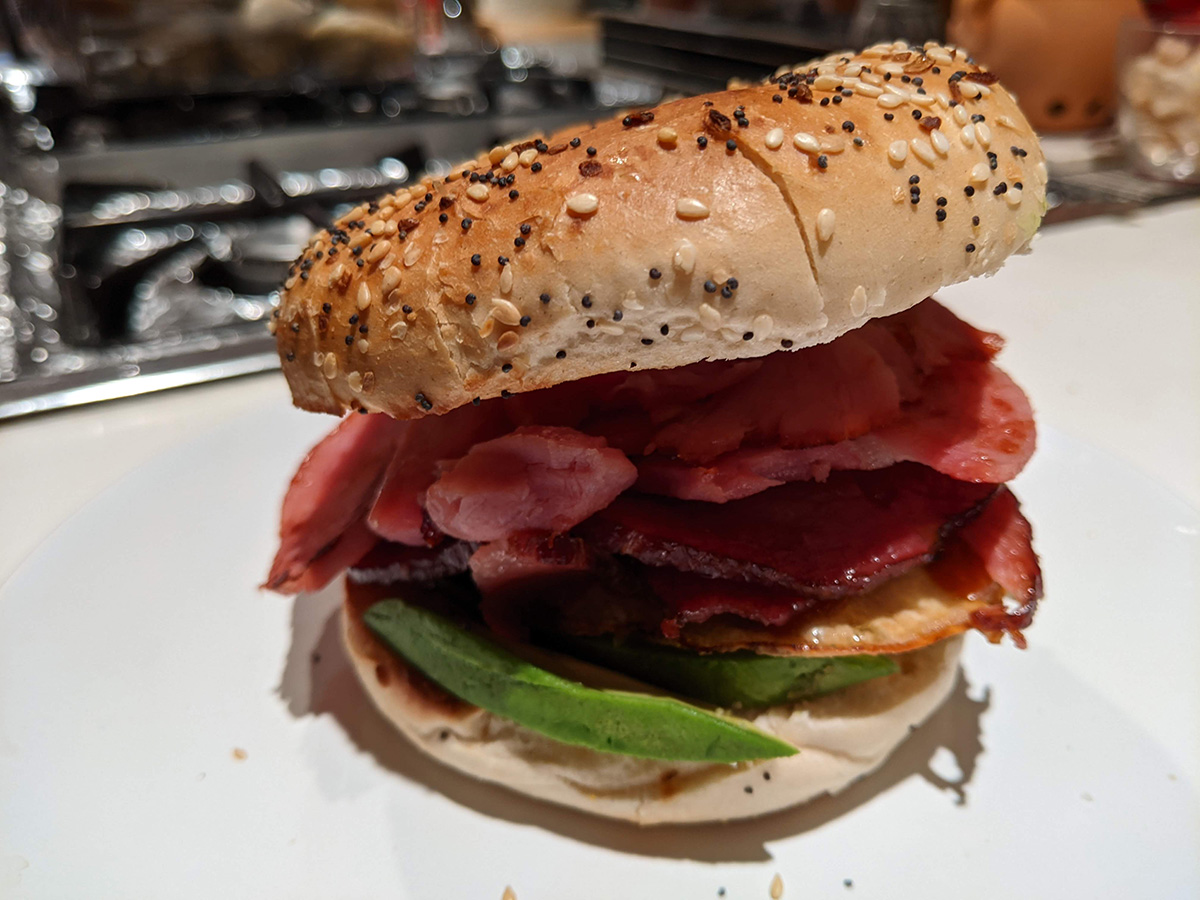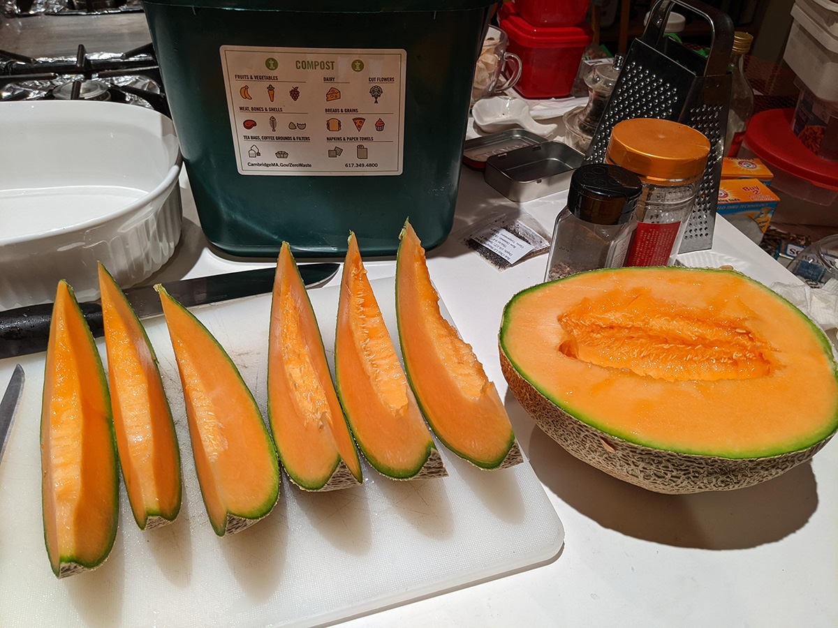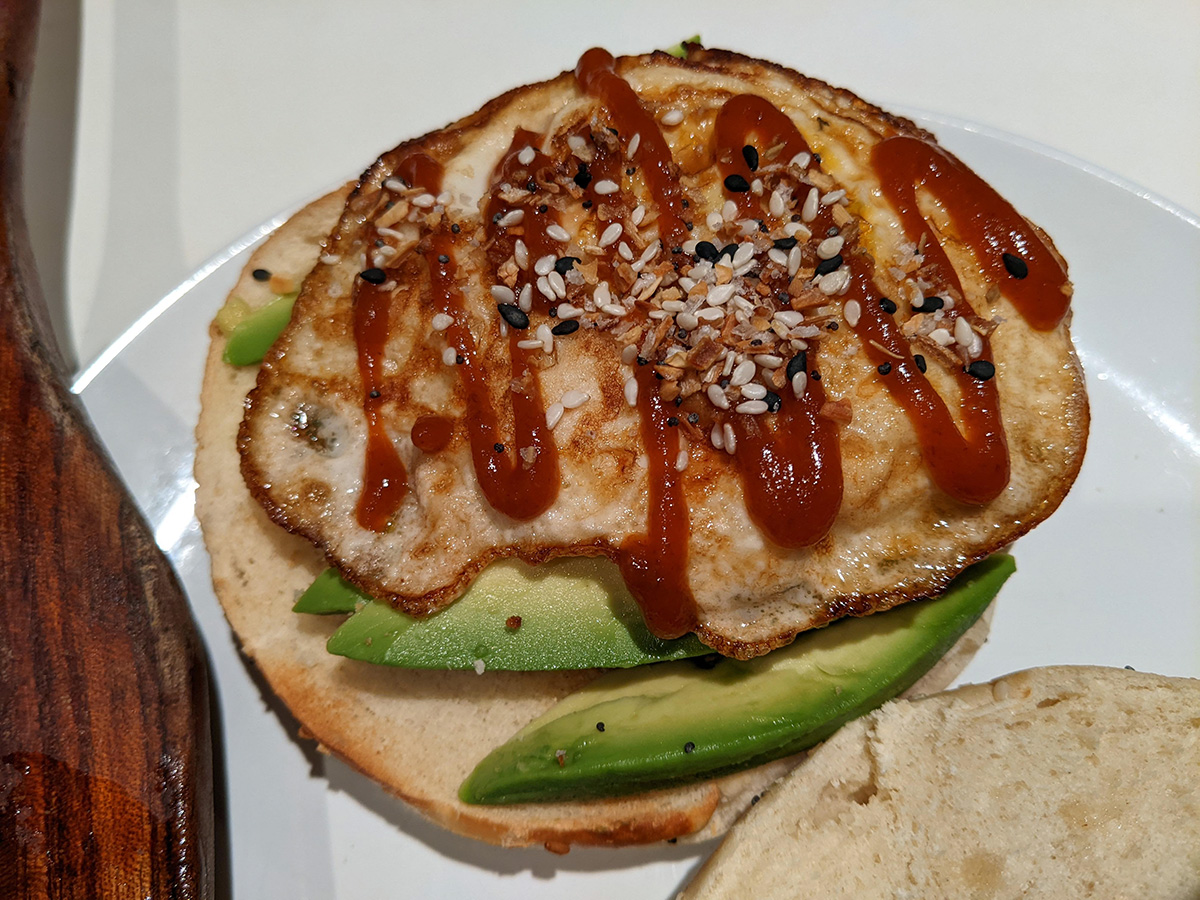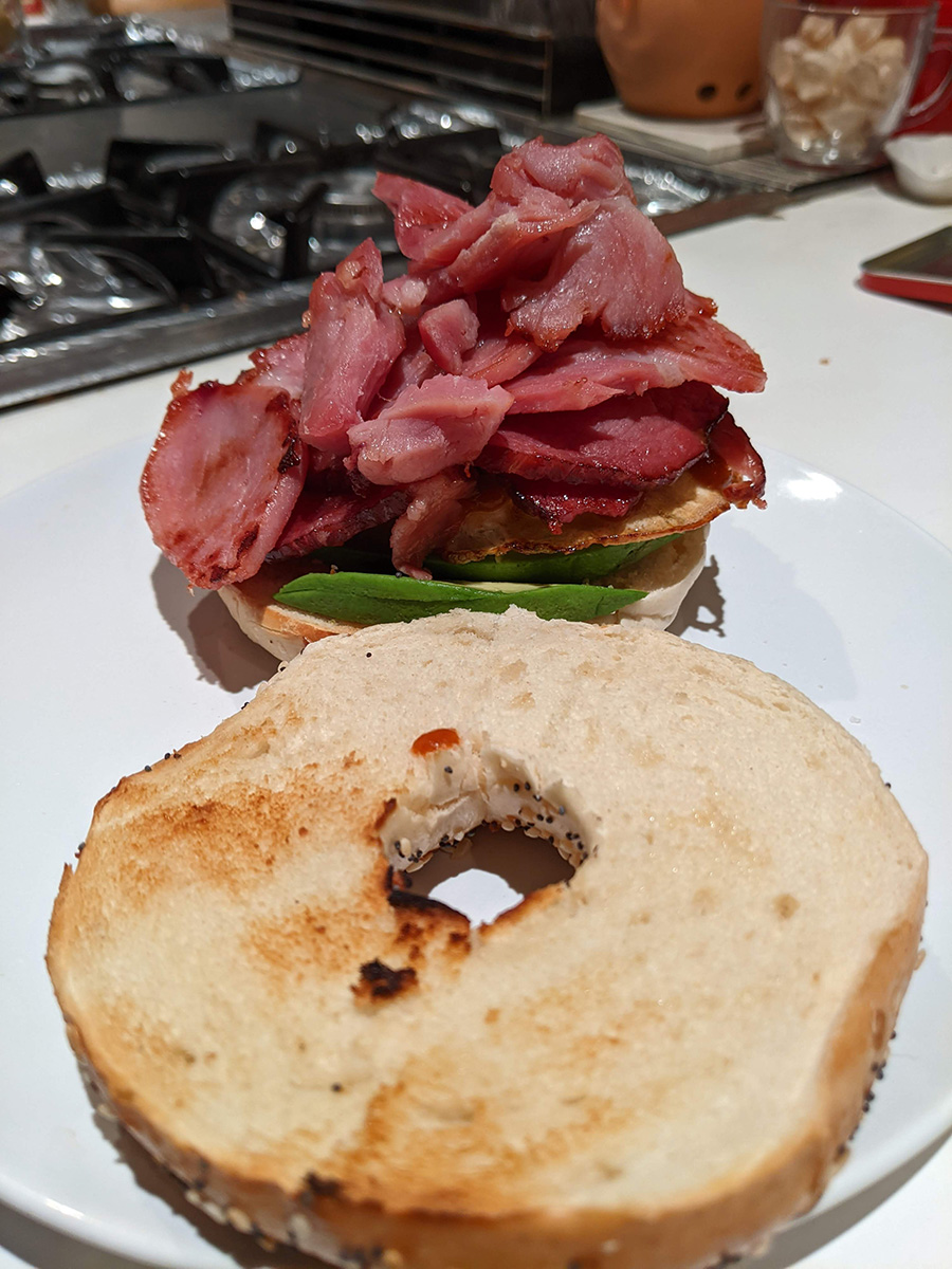 for dinner i made a classic grilled smoked ham & egg & avocado everything bagel sandwich with sriracha. the key is the ham, which caramelizes in the pan and the flavor really enhances. true, this is typically a lunch sandwich, but there's no reason why i can't have it for dinner. afterwards i cut up my cantaloupe and ate half, saving the rest for tomorrow.