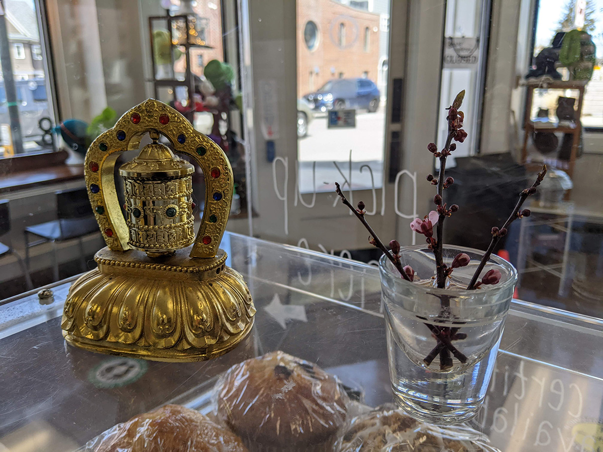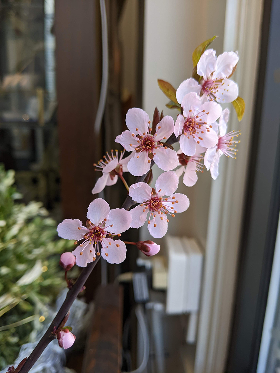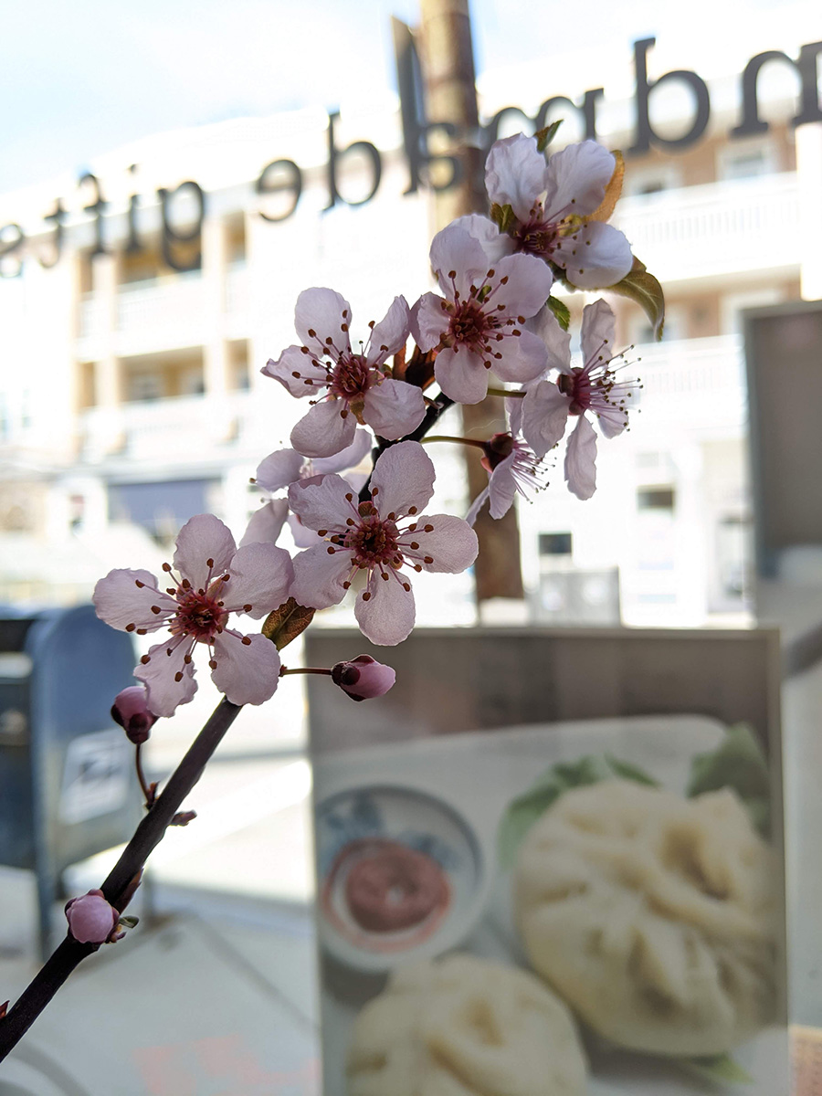 even though business was slow today, there was still enough things to do that the time went by quickly, for me anyway, between 11am to 2pm. my father fried some eggs and toasted some garlic bread for lunch, i had a chai latte that a customer ordered and later didn't want (she opted for bubble tea instead) and i also had a cup of coffee since we have way too much. my father divided up the hickory smoked ham we got yesterday morning from market basket. my sister made a pot of pork bone ramen broth. and the cherry plum branches i pruned off and my sister stuck in some vases have started to bloom (i posted an photo onto the cafe instagram account).