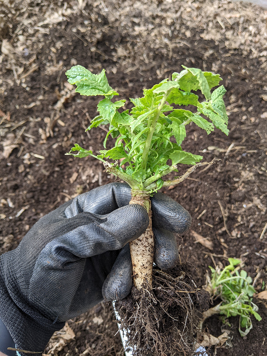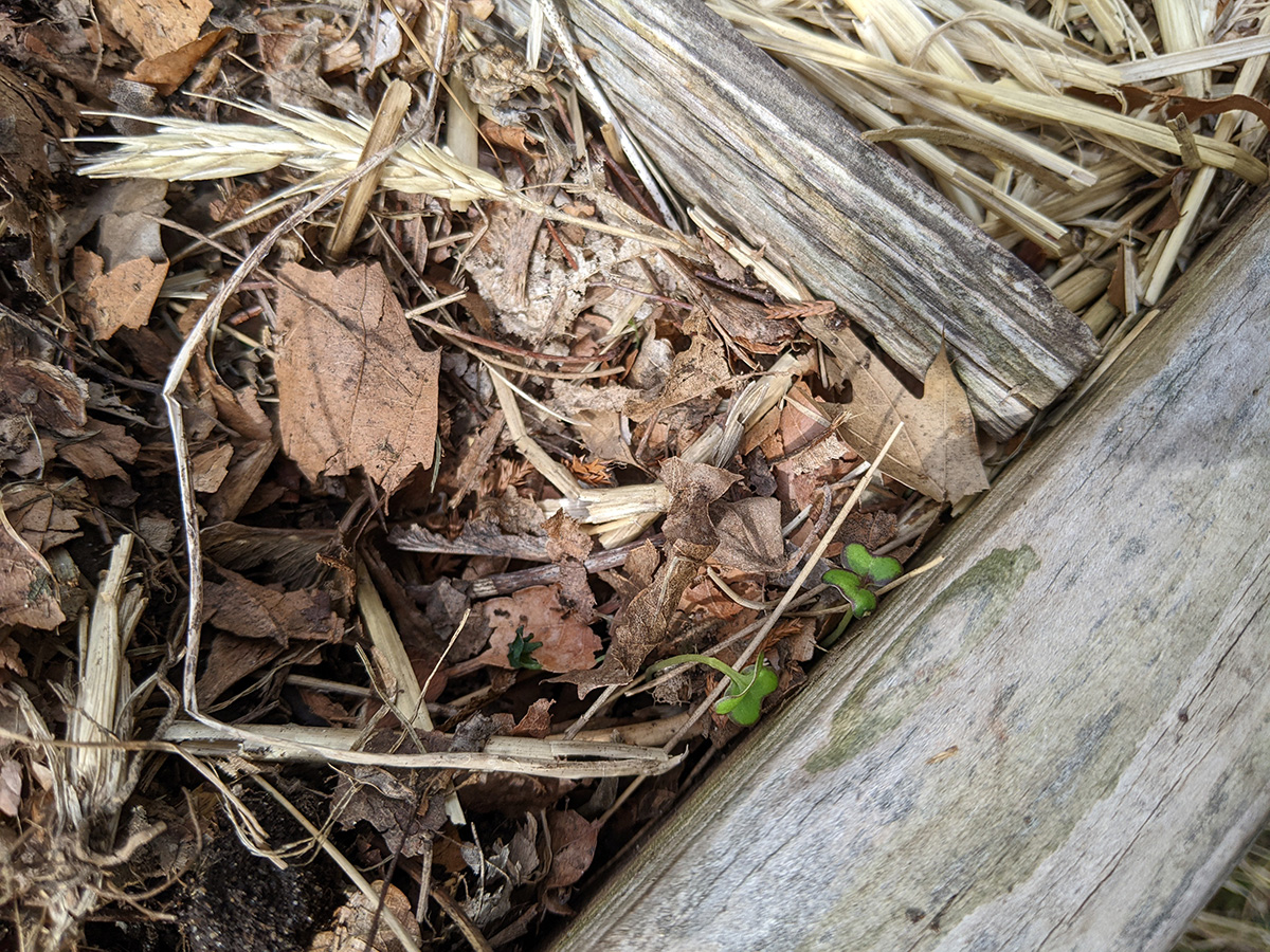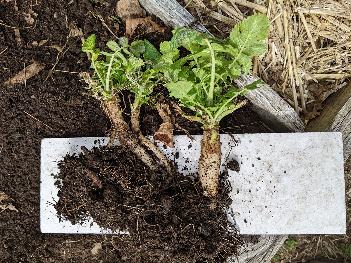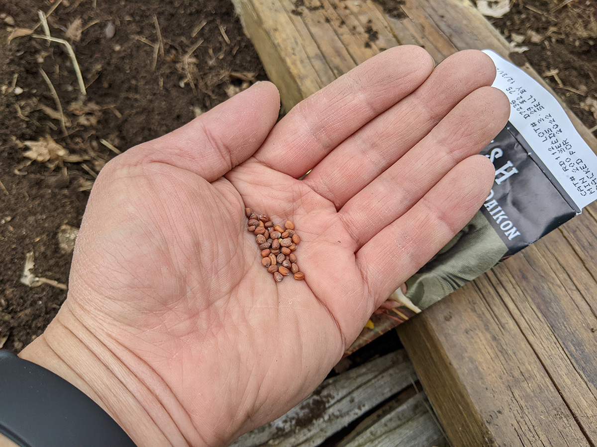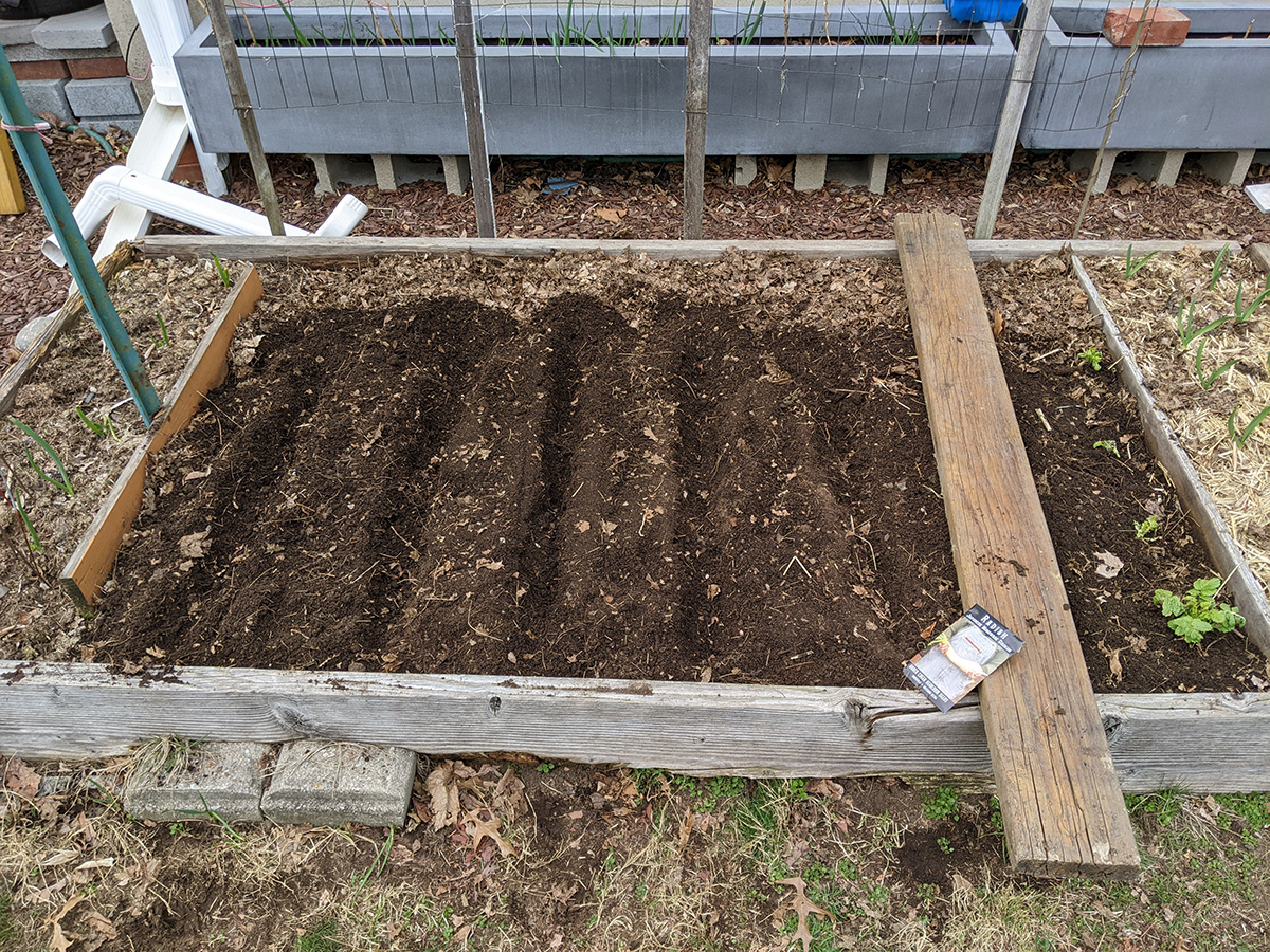 i left by 2:30pm, went to belmont to plant daikon radish and cilantro seeds in the backyard. i tilled the soil in RB0, RB1, RB2, and RB4, making sure not to go too far back where i've already planted wando peas about a week ago (not have emerged yet). RB2 already contained a few surviving daikons from last fall. i dug them up and relocated them, one of them had a daikon radish the size of a small hot dog. into the rest of RB2 i planted some daikon seeds. supposedly they don't do well in nitrogen-rich soil (they grew more leaves at the expense of tubers), so we'll see how they do. in RB0 i sprinkled a bunch of cilantro seeds that my father had soaked overnight. RB1 also had some cilantro seeds. the rest of the cilantro i planted in our newly expanded western garden bed.