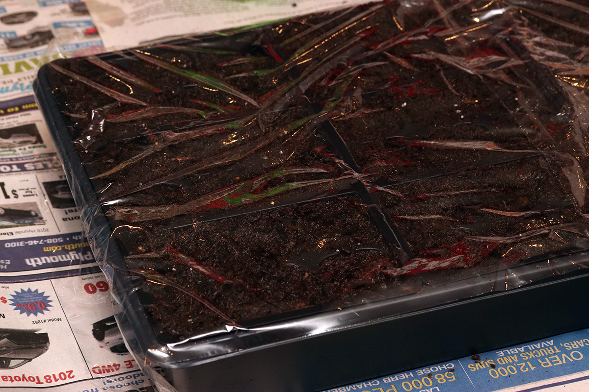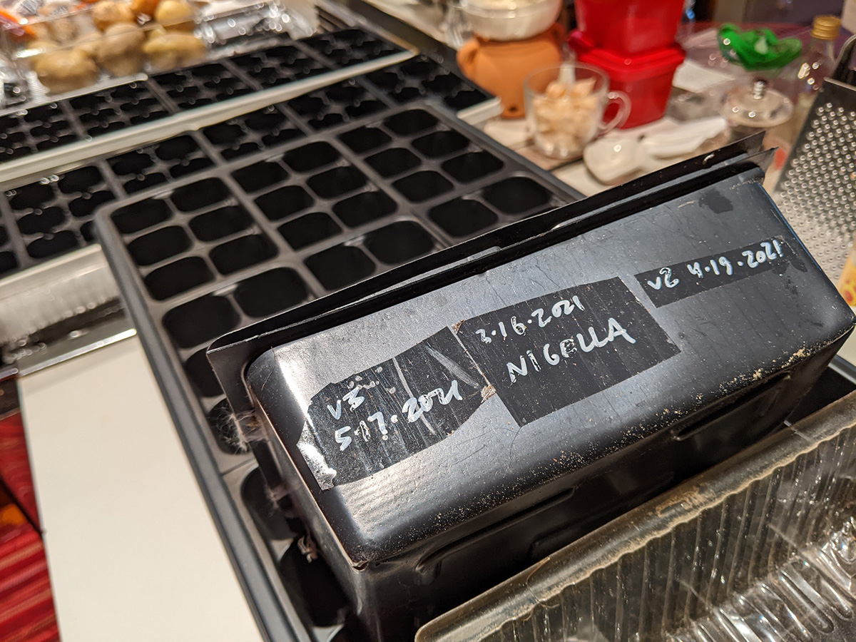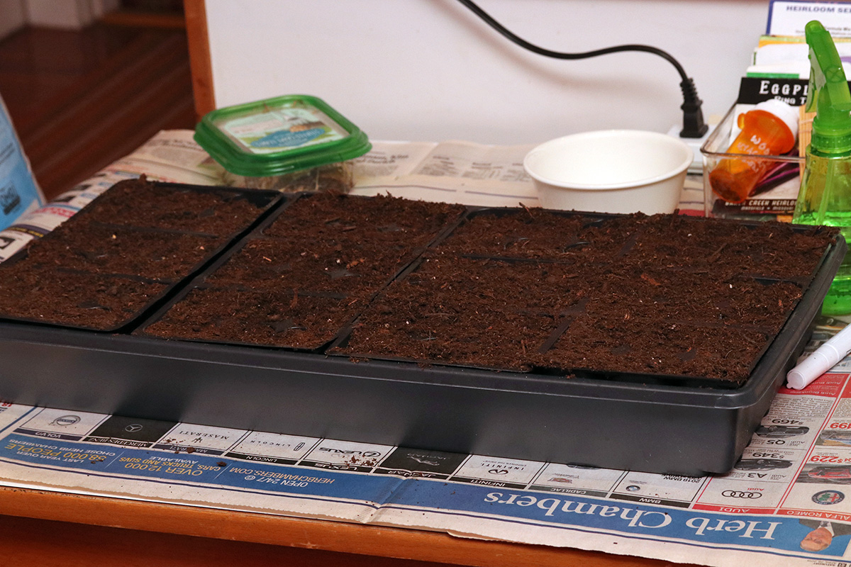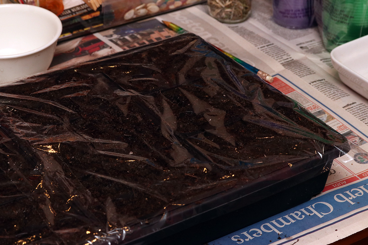 i didn't plant the seeds until 9pm. instead of the new trays i got, i ended up using old trays that were 3 conjoined 6-cells (18 total). the wet seeds were almost impossible to plant because they'd stick to my fingers. i planted a single bokchoi seed per cell, but for the celery i had way too seeds and they all clumped together, so i did the best i could, rubbed the seeds off my fingertips, then sifted them into the soil with a pencil.