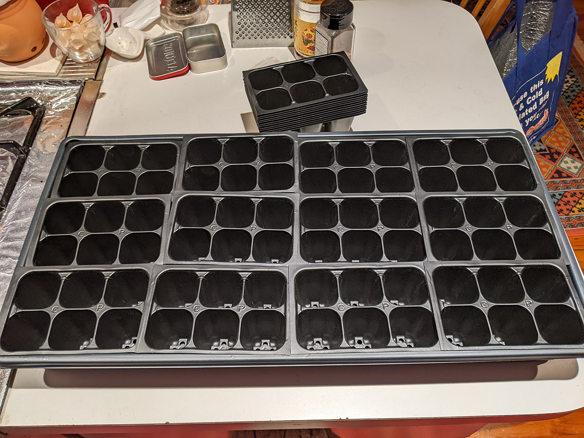 my seed starter trays finally arrived today (6pm), 24 6-cell trays ($5.50). i needed them so i could plant my chinese celery and shanghai baby bokchoi seeds. i used a whole growing tray, half celery (24 cells), half bokchoi (24 cells). they germinate best in cool temperature, so my house is perfect. i first had to soak the bokchoi seeds though.
