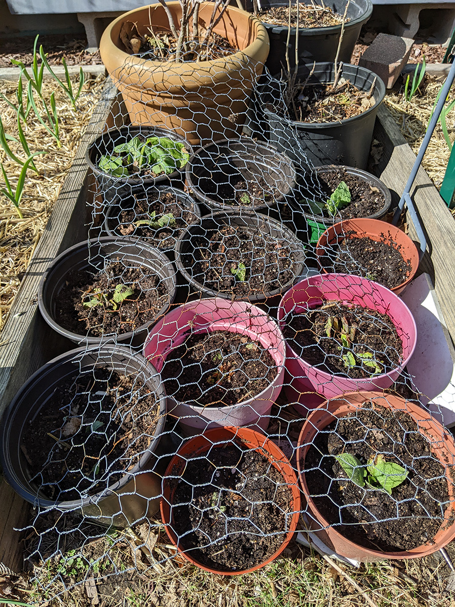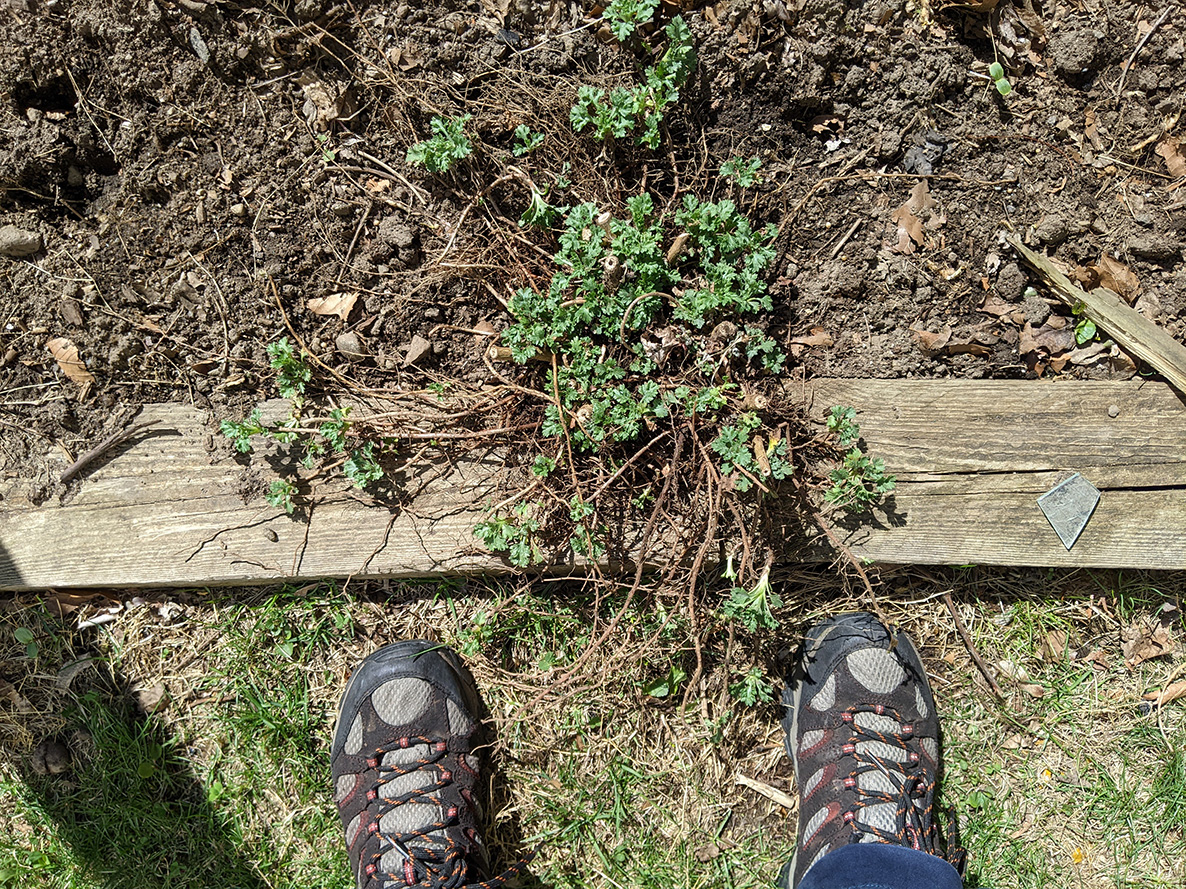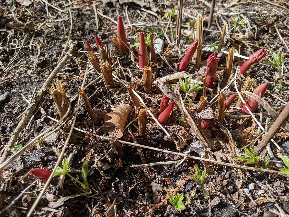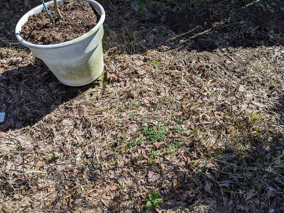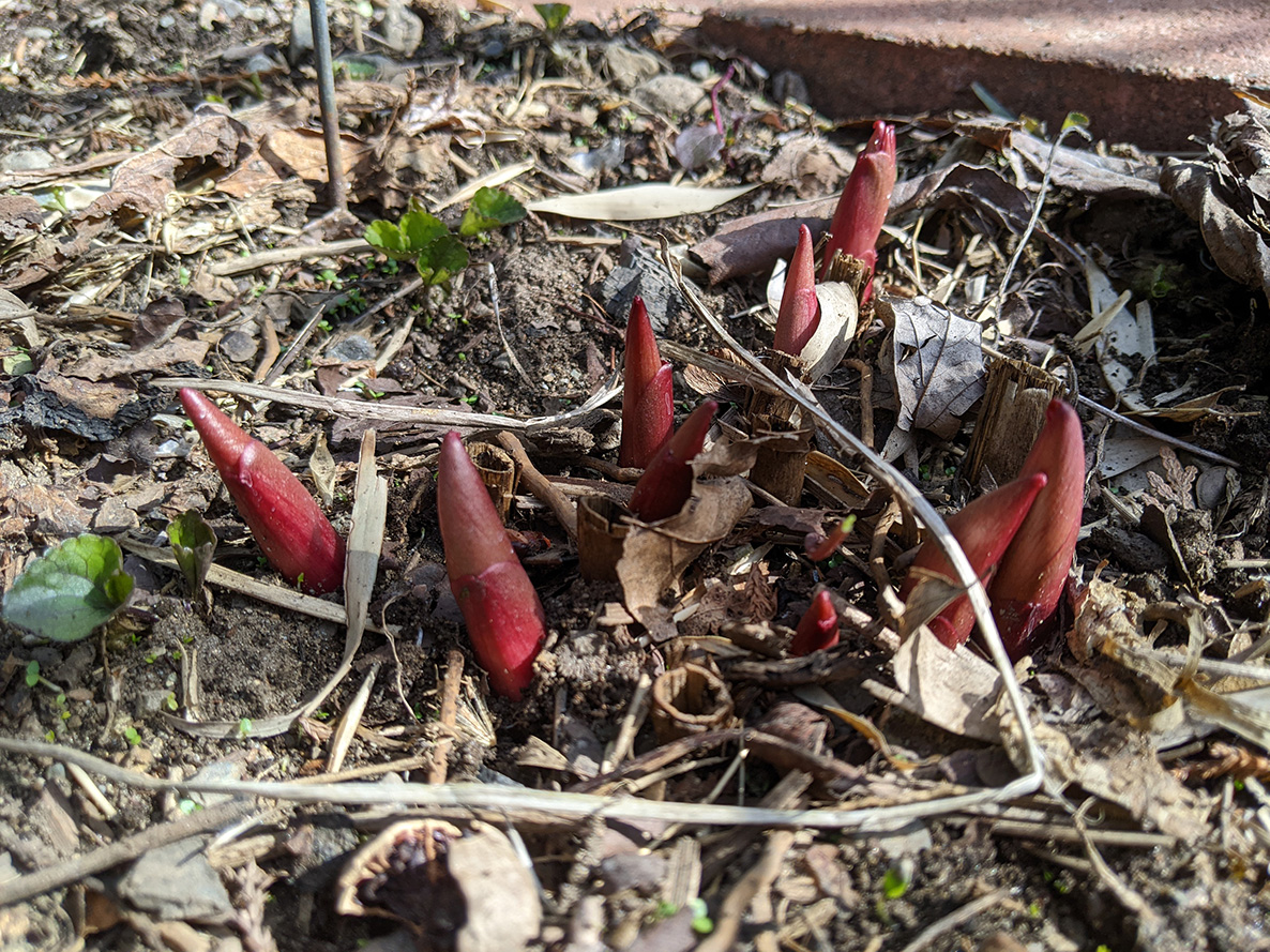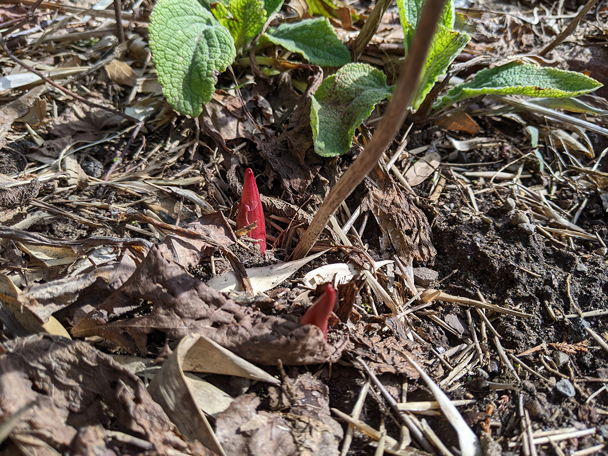 i raked the shady eastern perennial bed. we don't have anymore garden refuse bins, so i used some rubber bins as a temporary solution. nothing has emerged yet (no lily-of-the-valley, no hostas) with the exception of a small dutchman's breeches plant.
