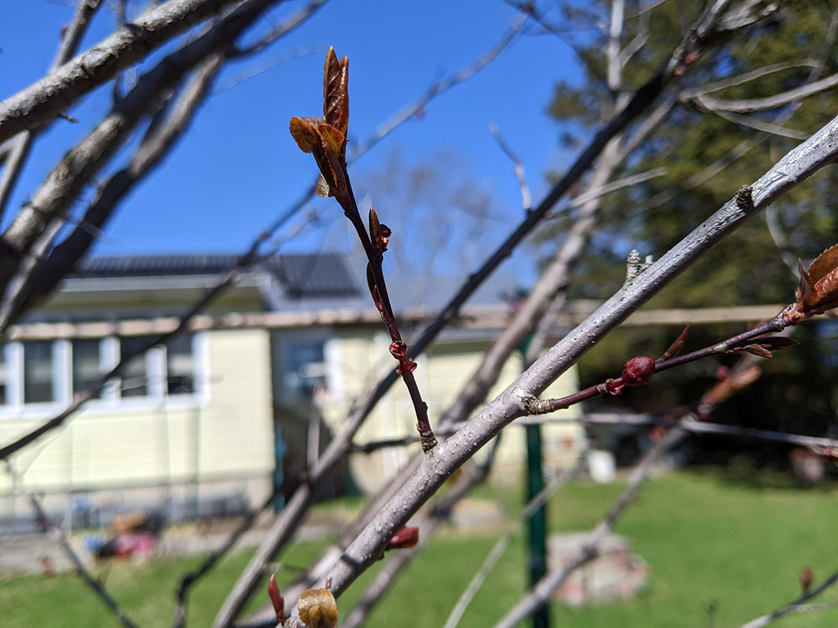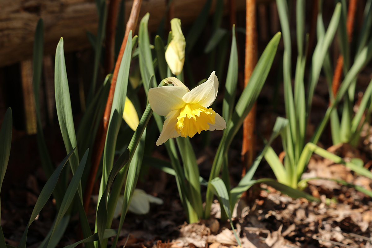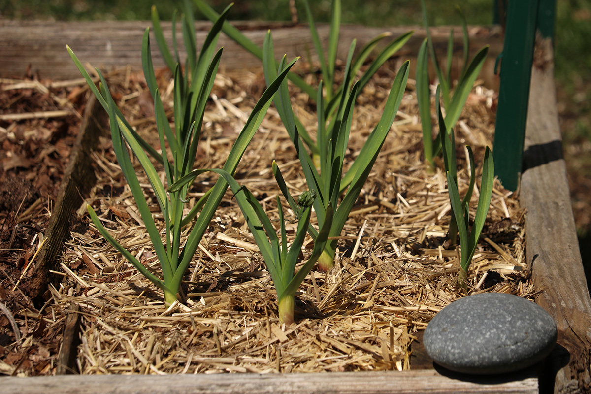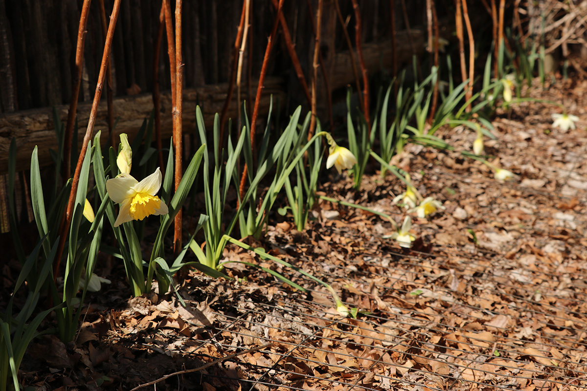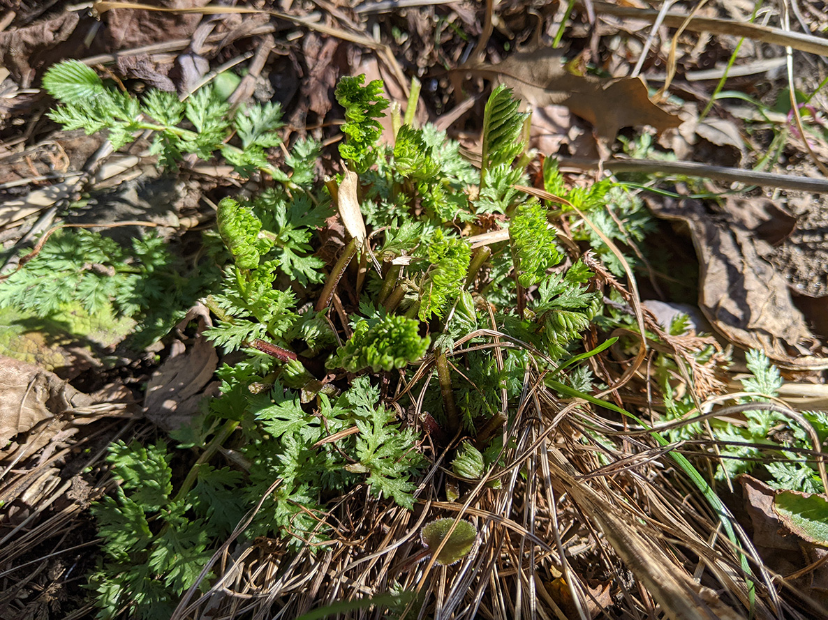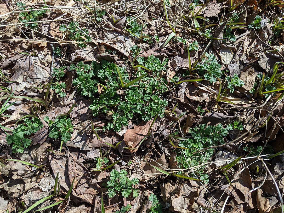 i raked the shady eastern perennial bed. we don't have anymore garden refuse bins, so i used some rubber bins as a temporary solution. nothing has emerged yet (no lily-of-the-valley, no hostas) with the exception of a small dutchman's breeches plant.