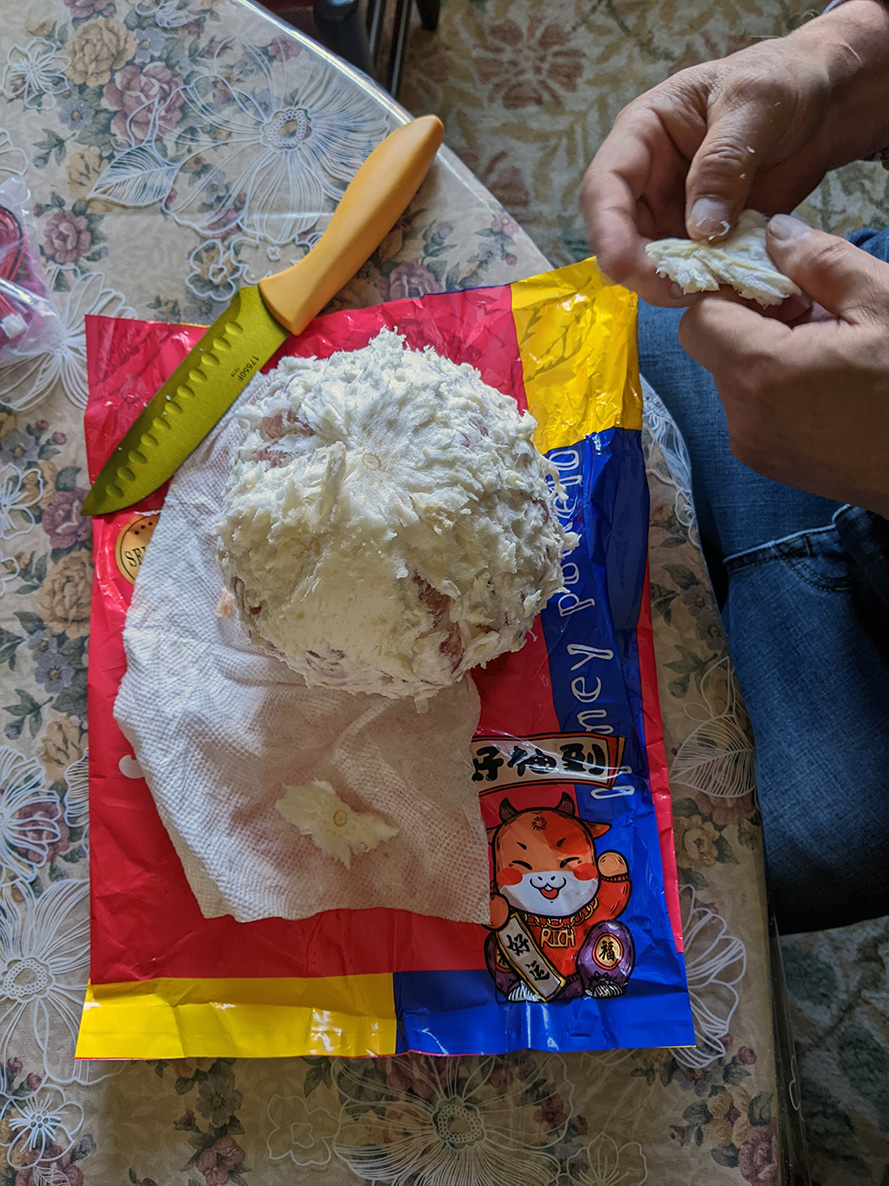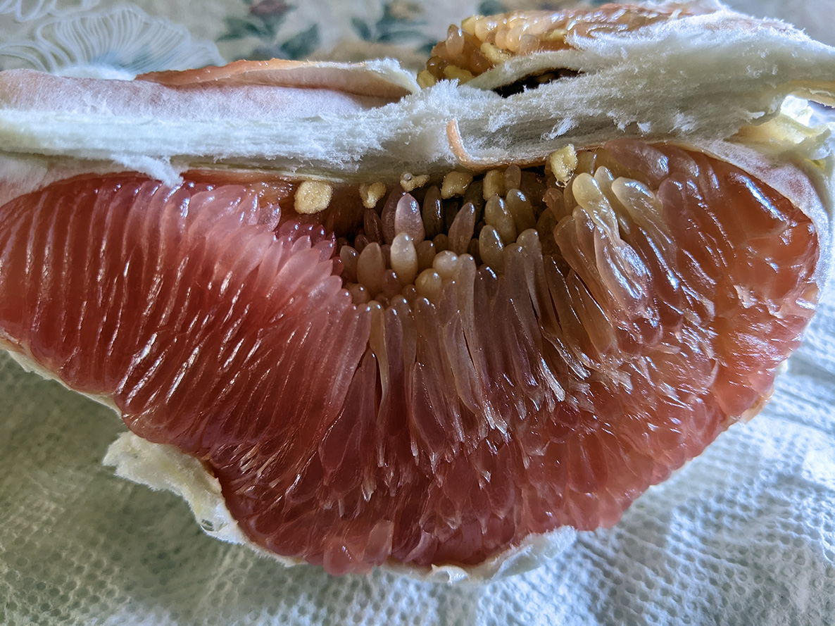 we ate the large grapefruit i bought from haymarket yesterday. it was okay, a little bland, kind of on the dry side, slightly sweet, not sour, but no real fragrance, not like a pomelo. it seems like maybe it was sold back in early february for chinese new year, and these were just the leftovers.