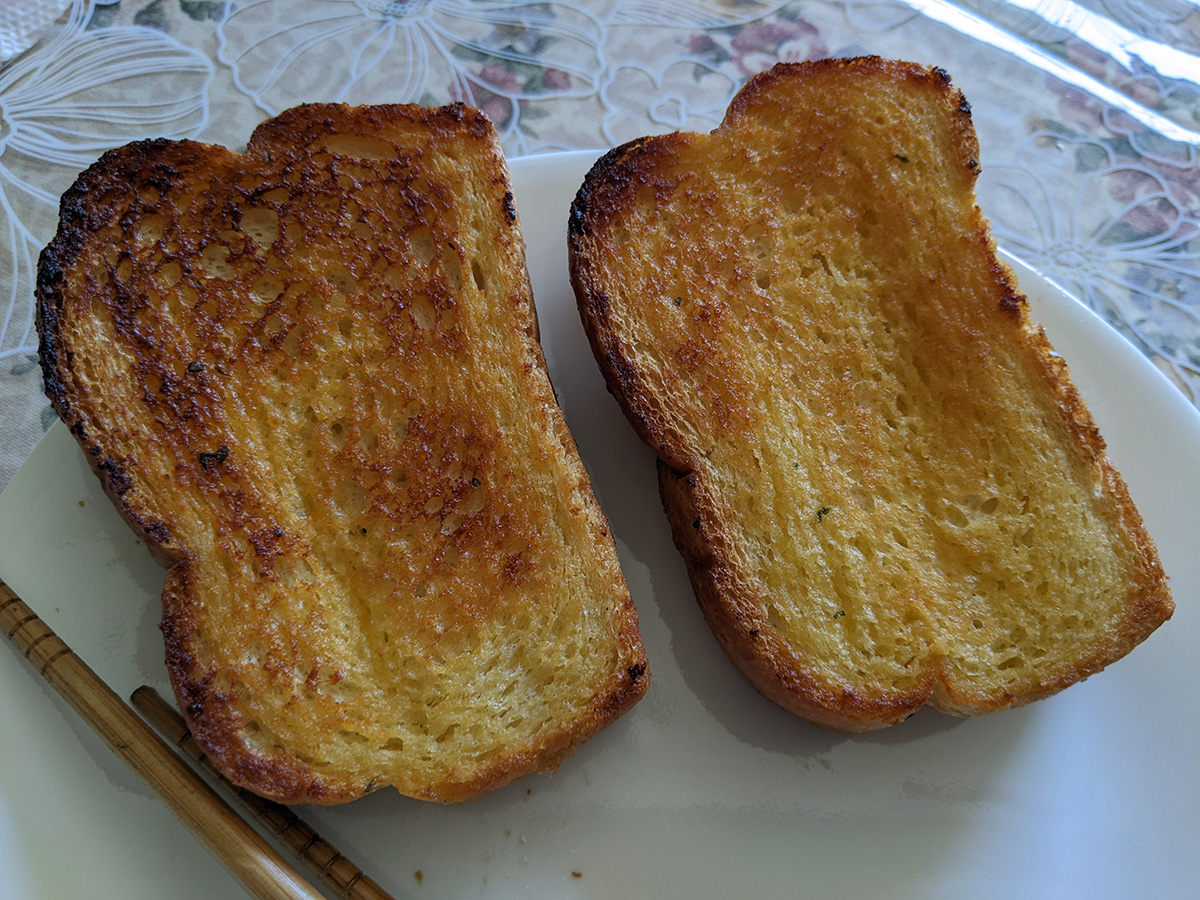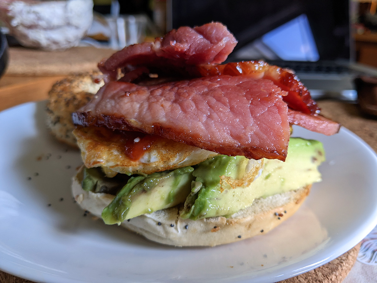 my father and i made ham-egg-avocado-bagel sandwiches for lunch today, with the defrosted ham i brought from my own house. i also had some garlic bread, which my father was already toasting when i arrived in belmont.