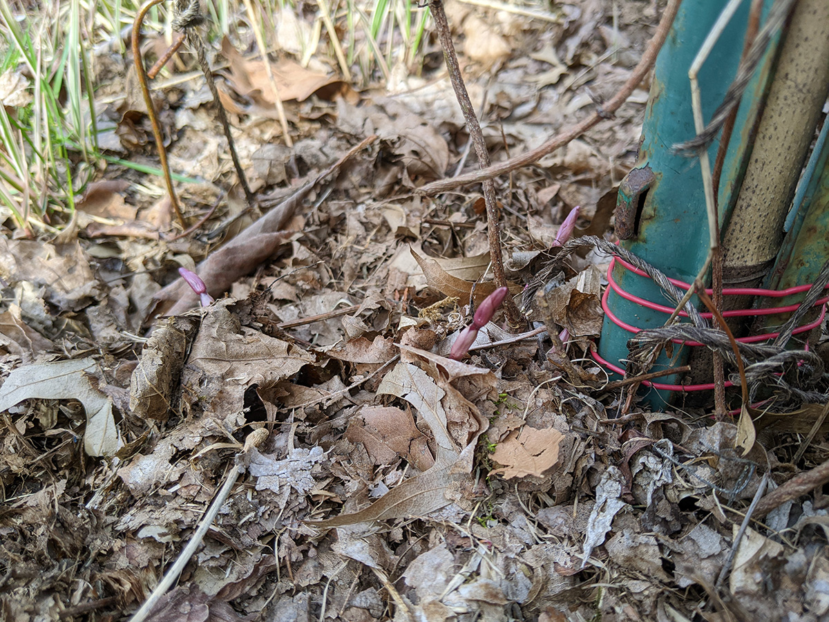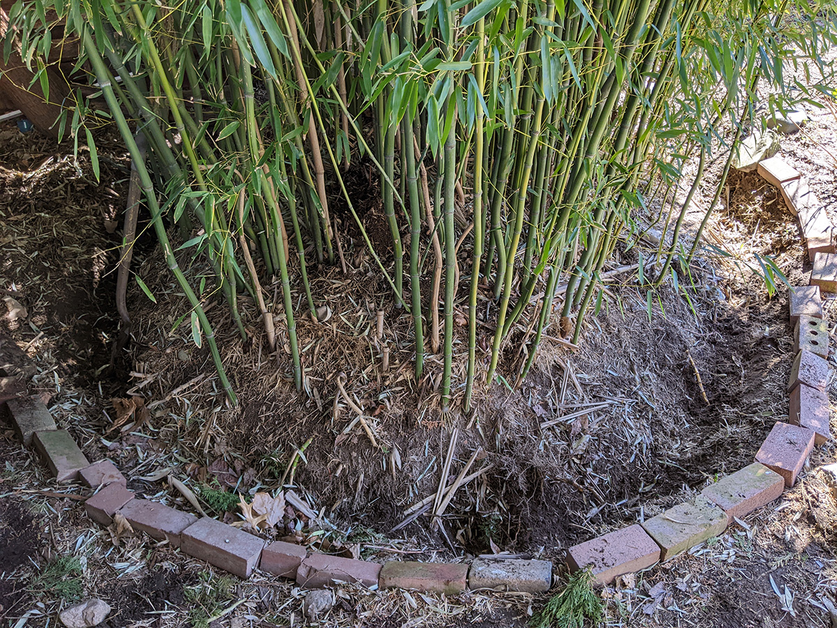 we cut up the stack of remaining maple branches sitting on top of the picnic table and put them into 5 garden refuse bins. i did some raking, cleaning up the leaf debris around the southwestern corner of the yard. whenever i saw an dandelion or some creeping bellflowers, i'd dig them up. i redug the bamboo moat, and discovered half a dozen escaping rhizomes that i either tried to dig up or i simply sprayed with roundup in the hopes of killing them. we moved out all the rain barrels, but we need to recaulk them before they can be used, as a few barrels were leaking last season. my father also helped me move one of the southern bed hostas. my father mowed the lawn, but there was hardly any grass tall enough to cut yet so we didn't have any clippings for the compost, which is all shredded leaves at this point (at one point my father had to go and get more gasoline, this is probably our last season with this mower, we're thinking about upgrading to an electric one).