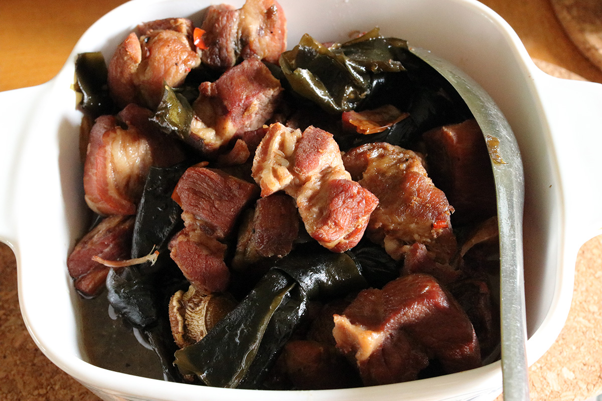 by the time i was all finished with gardening work, it was already close to dinnertime. my father braised some pork and beef (the leftover barbecued beef chunks from yesterday) and cooked up some cabbage with eggs.