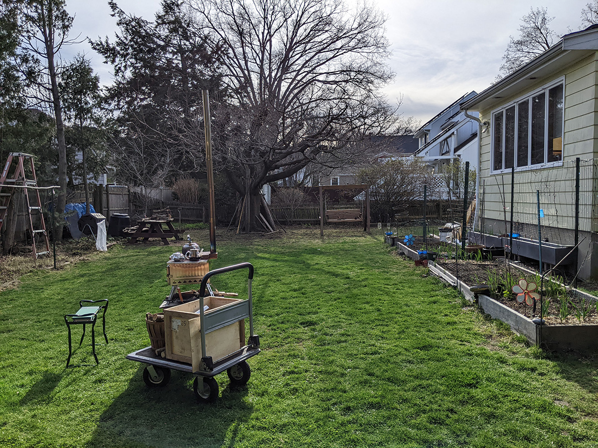 the moment i arrived in belmont around 11:45am, i was in the backyard doing yard work. my father had moved the cars out of the driveway so we could get access to the lawnmower. he also wheeled the tent stove into the backyard and was burning some wood. but the thing i noticed the most when i set foot outside was the stench of chicken manure. my father had opened a new bag, and had sprinkled some manure around the backyard. the smell was so foul, i was afraid neighbors would complain. i ended up putting some leaf compost on top of the raw chicken manure to cover up the smell, but i could still smell outside, as i kept discovering new places where my father applied the manure.