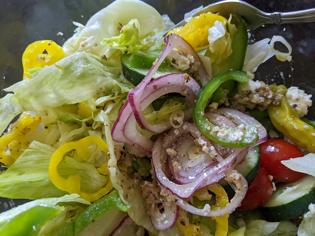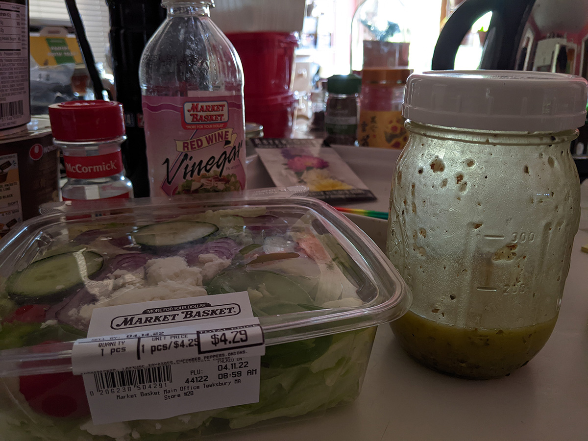 while i was at the supermarket, i couldn't resist getting a container of greek salad. do the salads come with dressing? i don't know, but it's easy to make my own, which is what i did when i got back home. unlike my last visit (where i forgot to bring my mask), most of the employees today had their masks on, in light of the increasing covid case numbers. i would've left there early but there was a line at the deli department, despite the fact that it was too busy in the rest of the store.