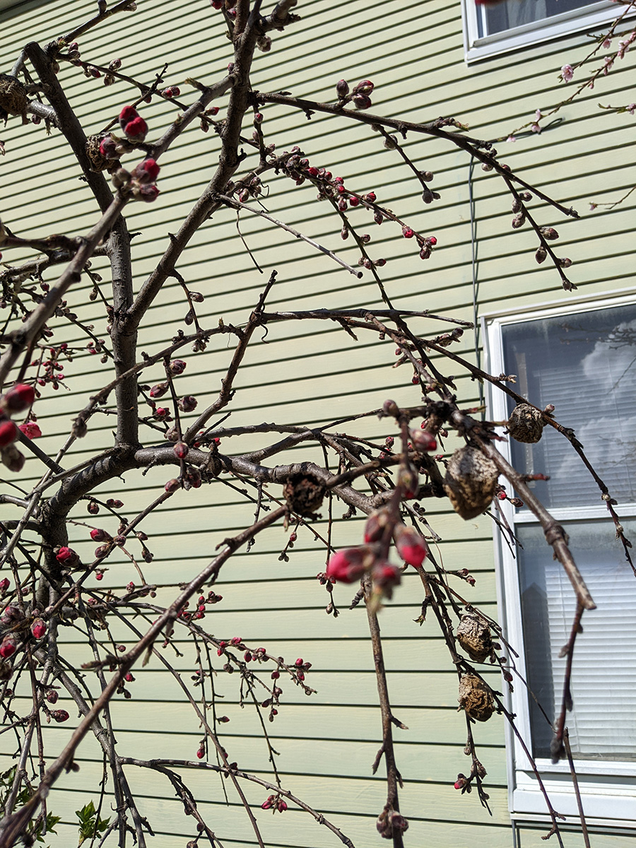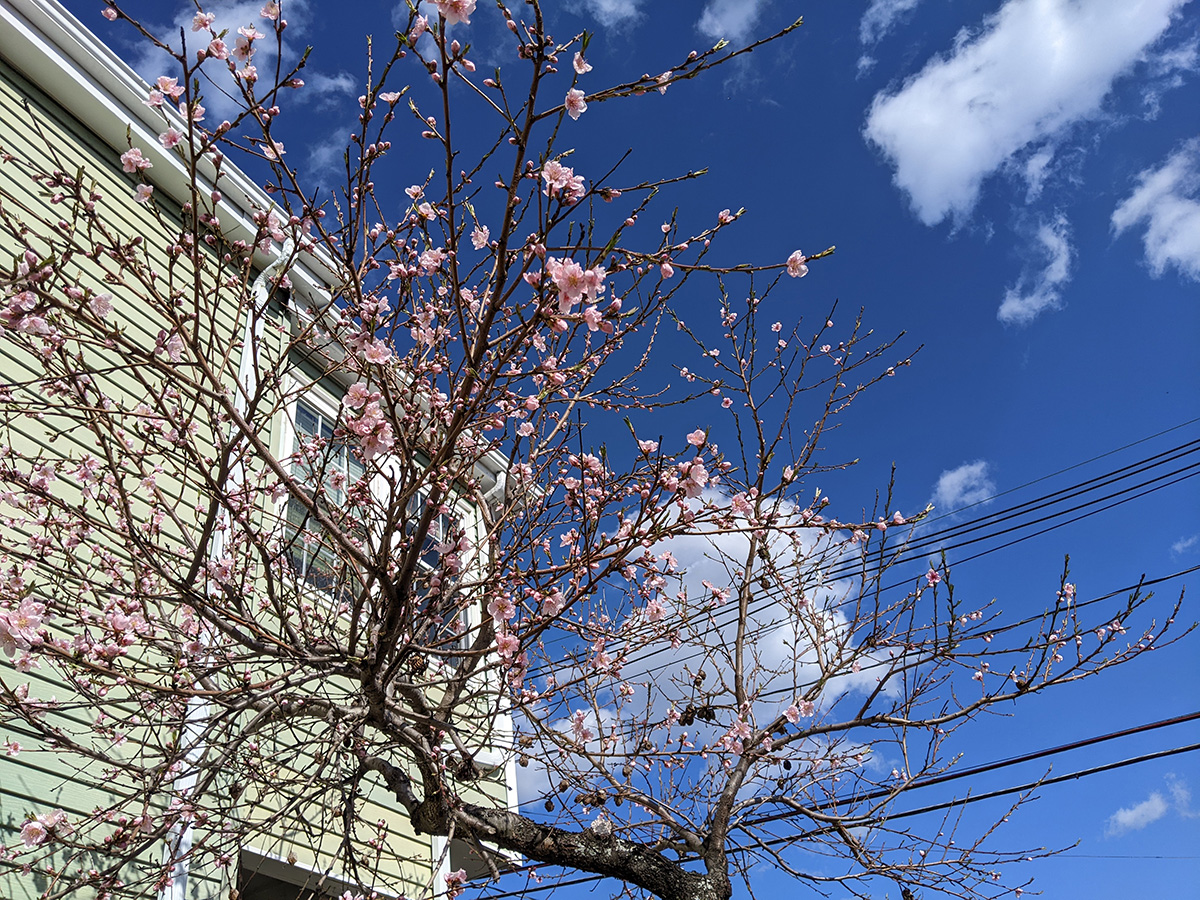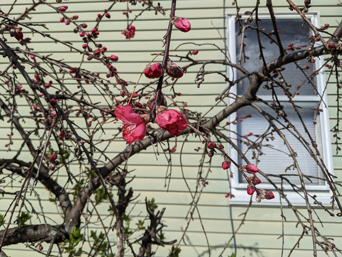 i biked to market basket, decided i'd make sandwiches this week. i stopped briefly at properzi way to admire some flowering plum blossoms. neglected by their owners and pruned haphazardly, they're planted in a very sunny spot and seem to thrive despite the mistreatment.
