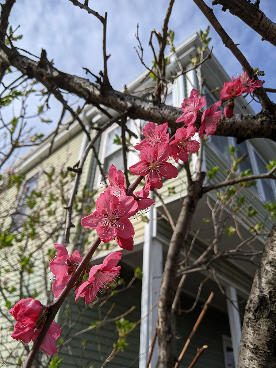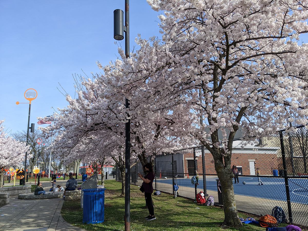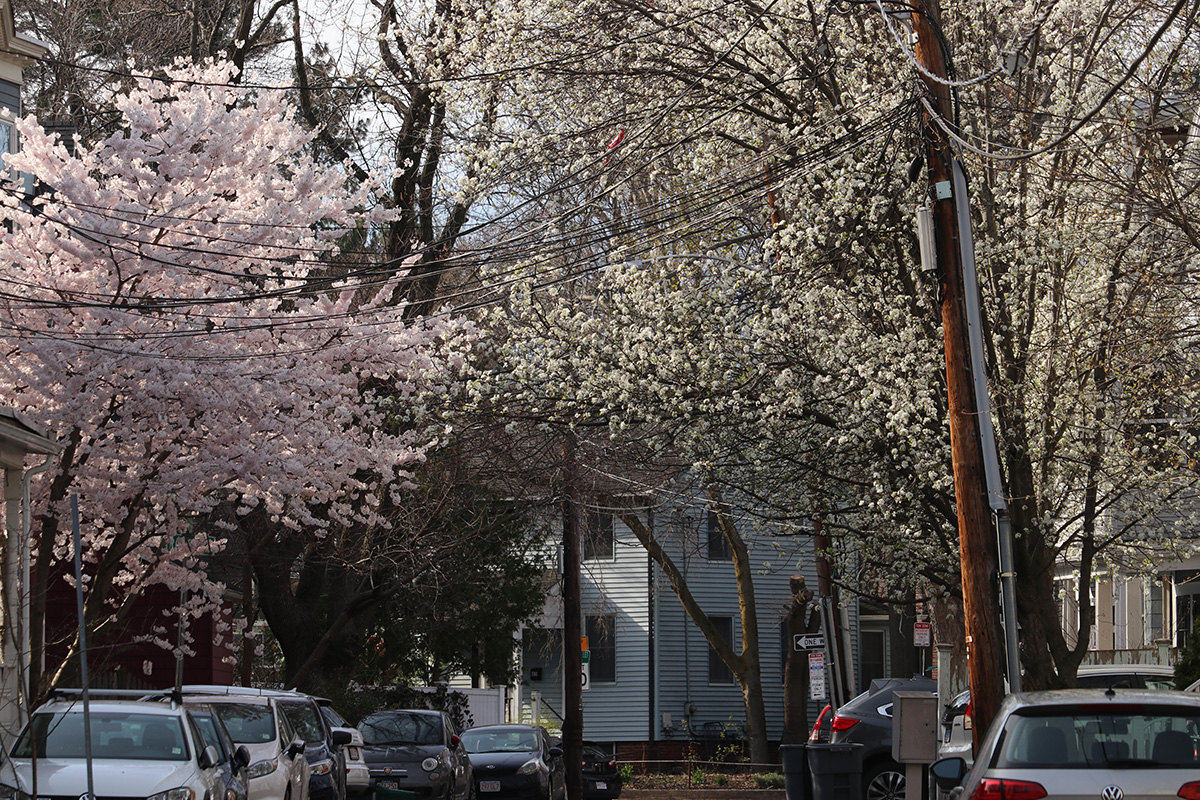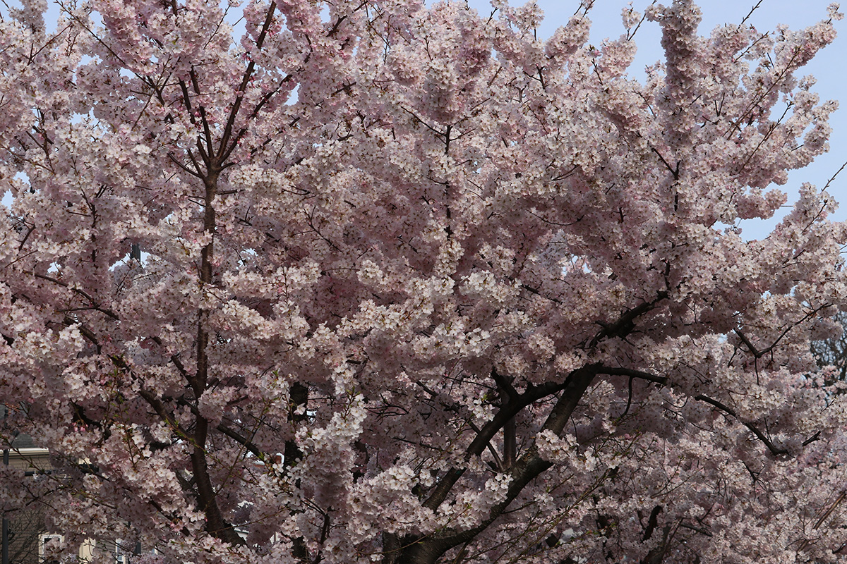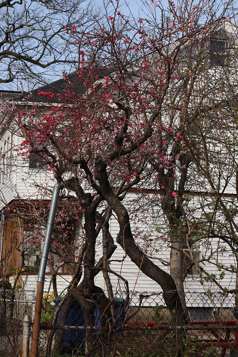 then there's a grove of light and dark pink blossoms on spring street. i've visited this place many times, always hoping to catch the owner of the house so i can ask them about the trees. these seem to be the same dark pink blossoms as the ones on properzi way. finally, that little park by bleachery court has a stand of light pink yoshino cherries that are like pink clouds. the bees were loving it, the sky buzzing with pollinators.