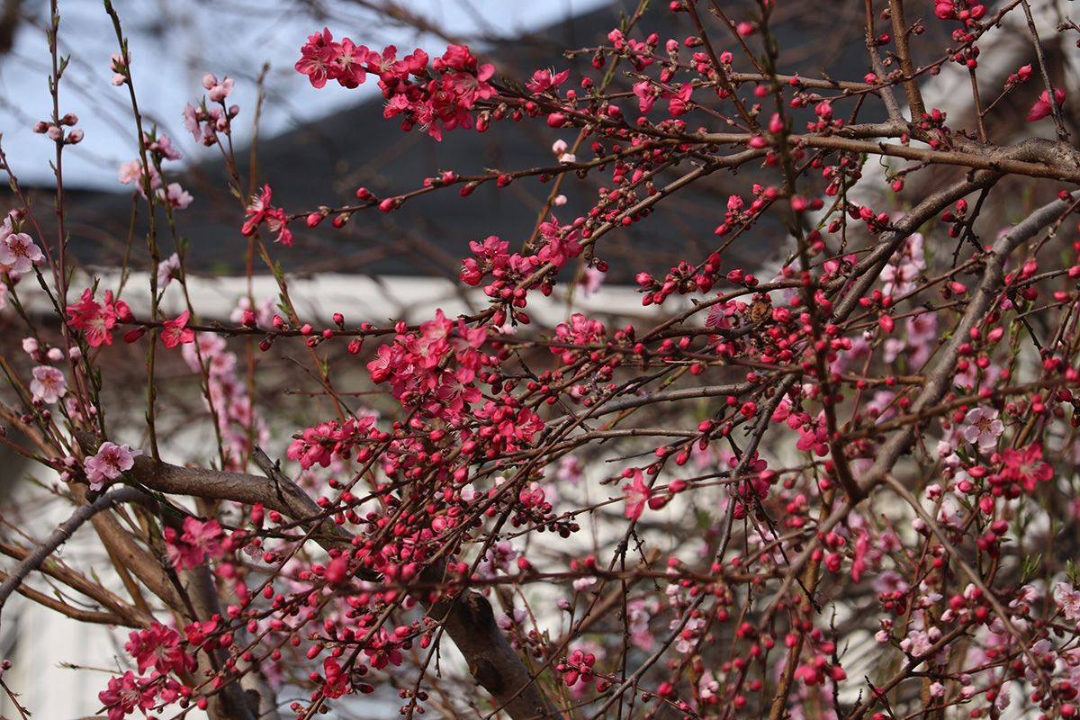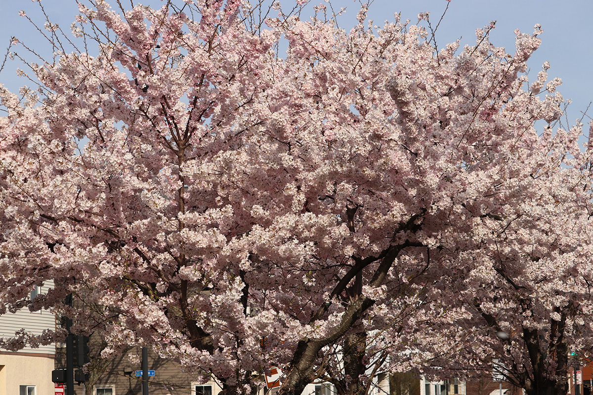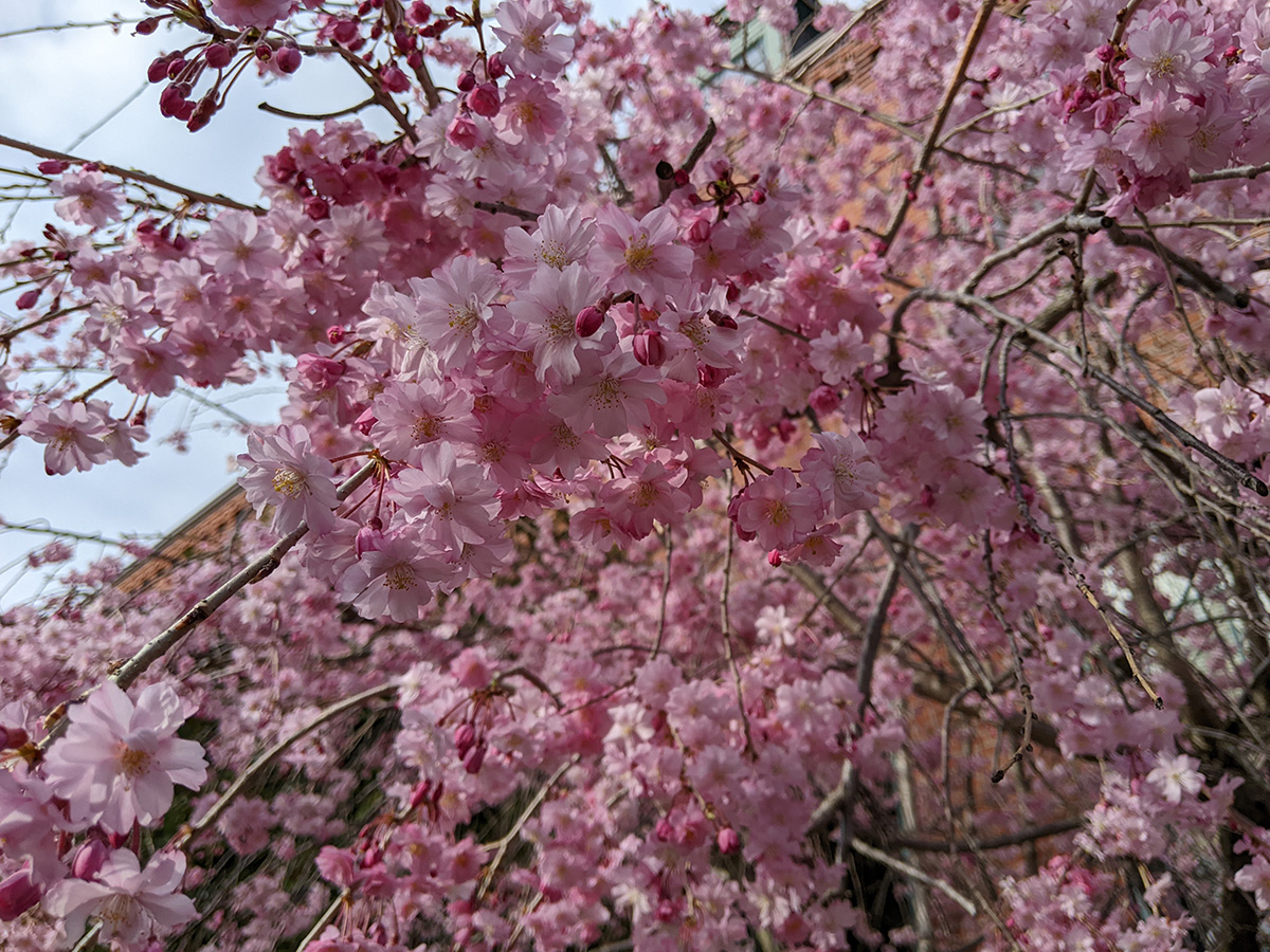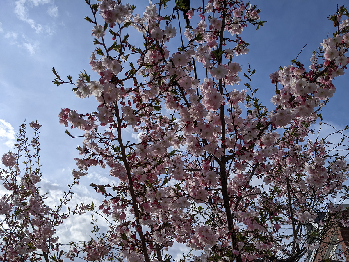 then there's a grove of light and dark pink blossoms on spring street. i've visited this place many times, always hoping to catch the owner of the house so i can ask them about the trees. these seem to be the same dark pink blossoms as the ones on properzi way. finally, that little park by bleachery court has a stand of light pink yoshino cherries that are like pink clouds. the bees were loving it, the sky buzzing with pollinators.