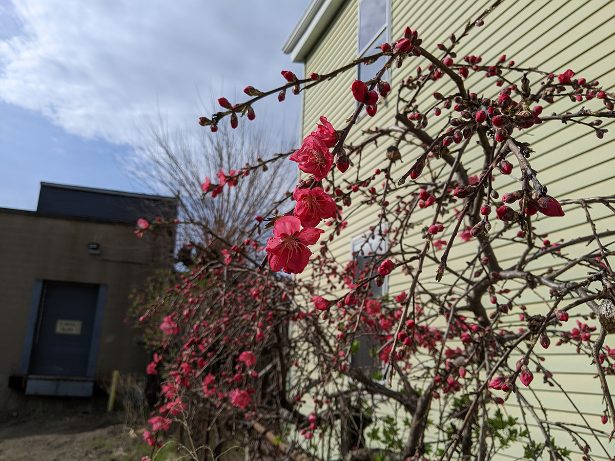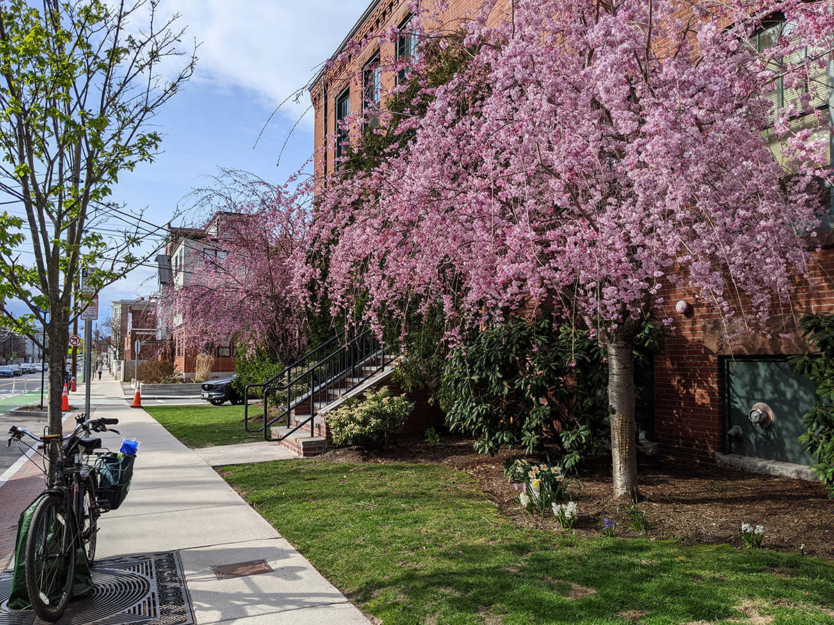 of course i stopped to admire some of the cherry blossoms i saw along the way. the dark pink blossoms on properzi way, i still have no idea what kind they are. i don't think they're cherries because yesterday i saw the dried fruit and they're much large, like a plum. but all the stuff i've read says they're not plums at all. they're definitely not peaches, which usually have a pink blossoms with a deep pink center. i also stopped to admire some weeping flowering cherries on beacon street.