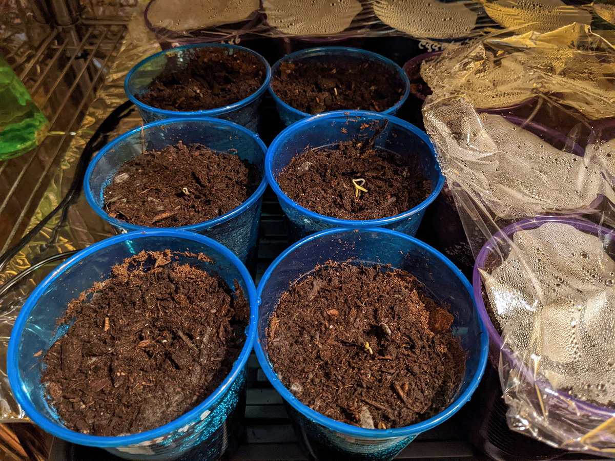 i checked my seeds again, now all the tomatoes (6) have germinated, which is a relief, because i was starting to get worried that there was something wrong with my setup. every spring there's always that leap of faith from when i plant my seeds to when they germinate. i wait and wait, and nothing seems to be happening, then the magic of life and the seeds finally do sprout.