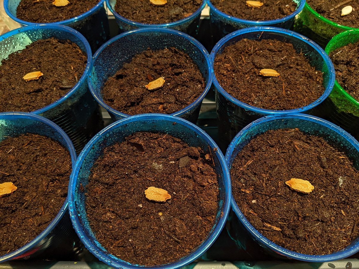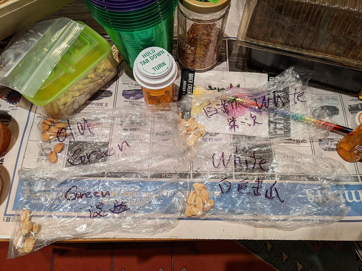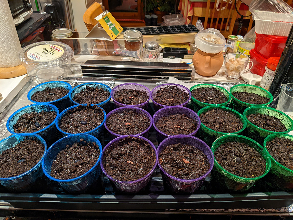 around 9pm i got around to planting a second batch of seeds: 9 white bitter melons, 9 buttercup squashes, 6 blue beans, 6 long beans, 6 hyacinth beans. it took a long time to pack the potting soil then soil them in water before planting. in all, it took 1-1/2 hours and i wasn't finished until 10:30pm. i went with white bitter melons because they're more special, as taiwanese bitter melons are typically white. i didn't bother soaking the seeds, it's hard for the water to penetrate the seed shell anyway. i am however using the heating mats to speed up germination. there's some controversy regarding starting bean seeds indoors. last year, the ones we grew inside and transplanted didn't do well, but i think part of it had something to do with the fact that we planted them too early, when the weather was still cold. long beans in particular do best in warm weather. we have enough seeds to plant them outside.