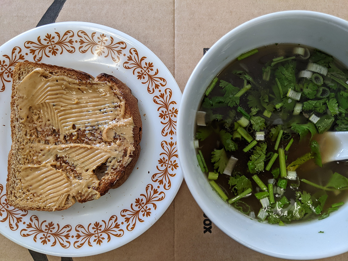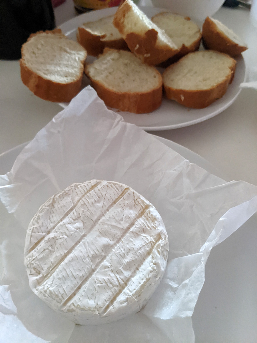 this morning at the cafe i had a slice of toast with peanut butter and some beef broth soup, but that was a farcry from a decent meal, so i was looking forward to the sushi. i didn't realize i got chicken teriyaki (would've preferred some kind of fish), but it tasted pretty much the same. afterwards i cut up some baguette slices and ate them with a brie cheese spread.