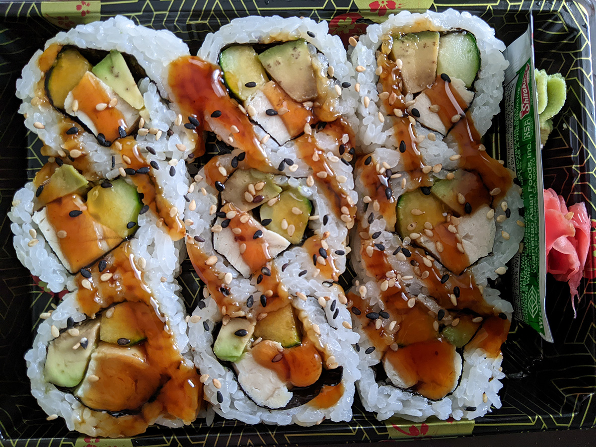 i left MGH by 4pm. i stopped by the veterinarian to pick some medication for hailey. i also took a detour and went to market basket, where i had a craving for sushi and cheese. i ended up picking a package of chicken teriyaki sushi, and some brie cheese with a fresh baguette.