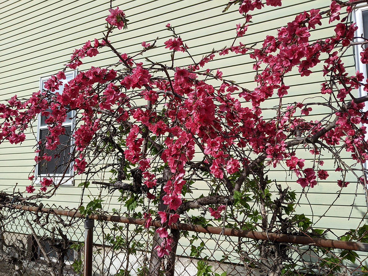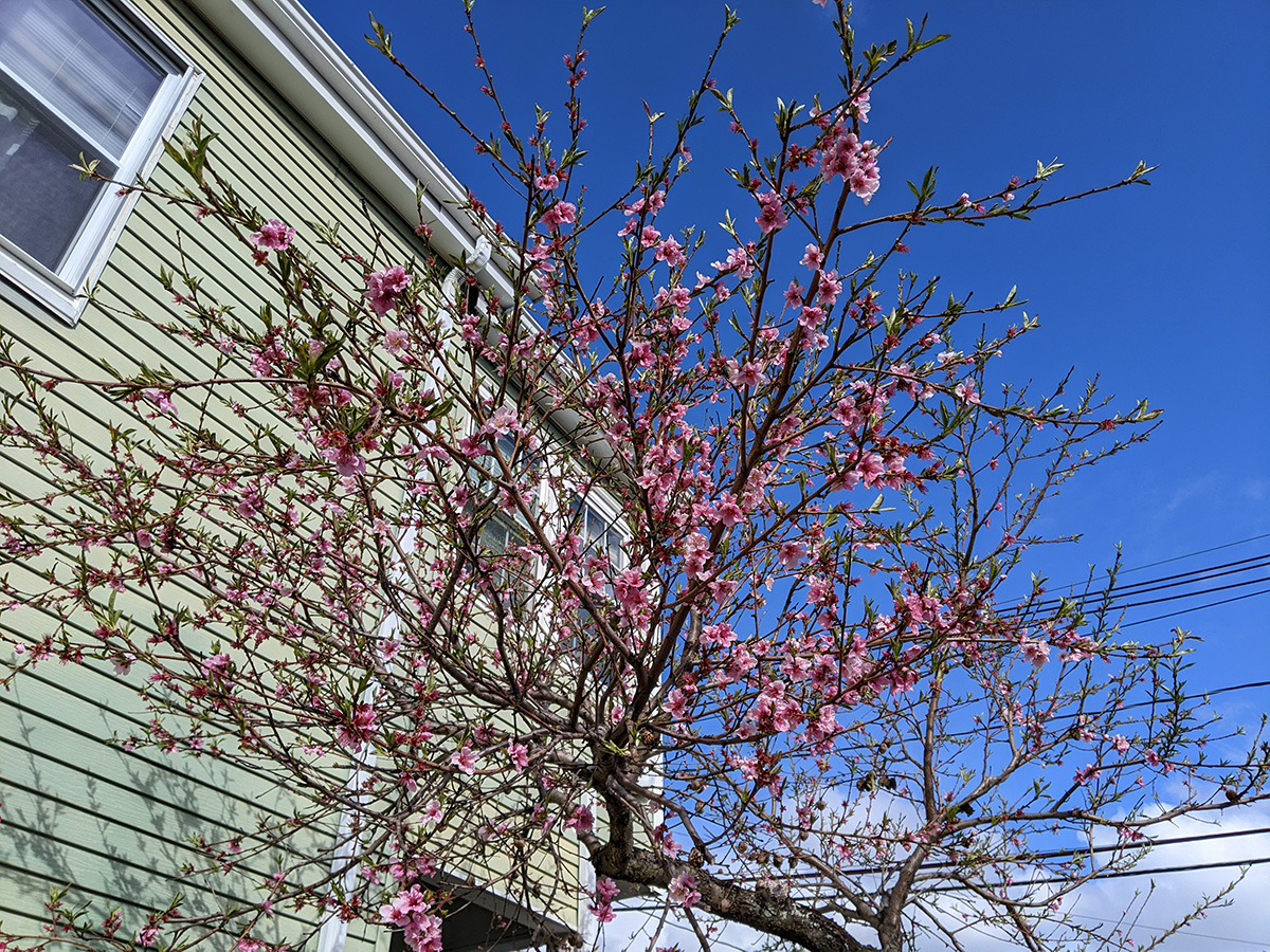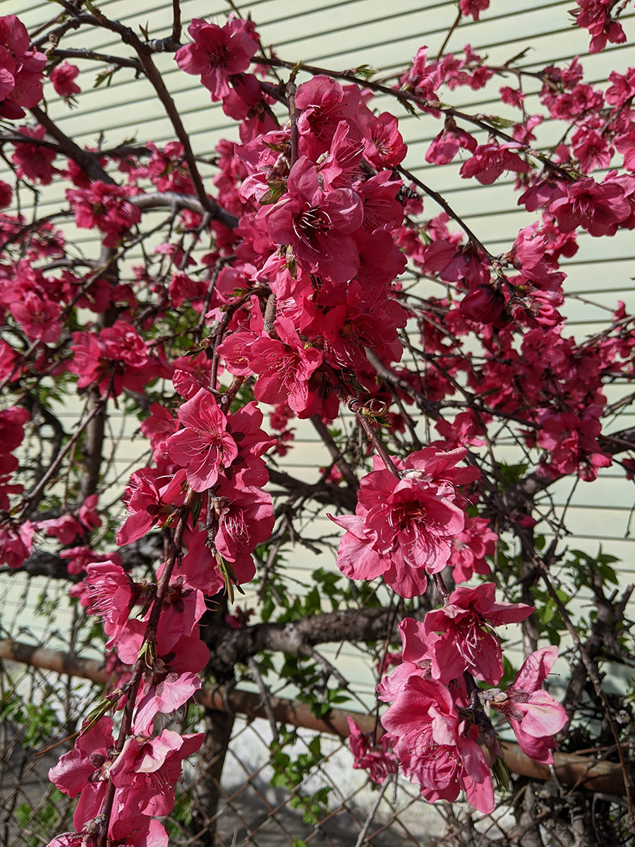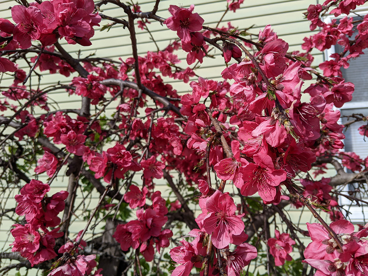 i stopped by properzi way to admire the flowering blossoms again. only today did i realize what they are: they're flowering peaches. i never made that connection because i thought peach flowers were light pink with a deep pink interior, but there are also a lot of varieties with peaches, and some can be pink like cherry blossoms, but only peaches (of the prunus family) can have that deep pink color. just a few days ago online i came across the 'red baron' peach tree, which showed me what other colors peach blossoms can be.