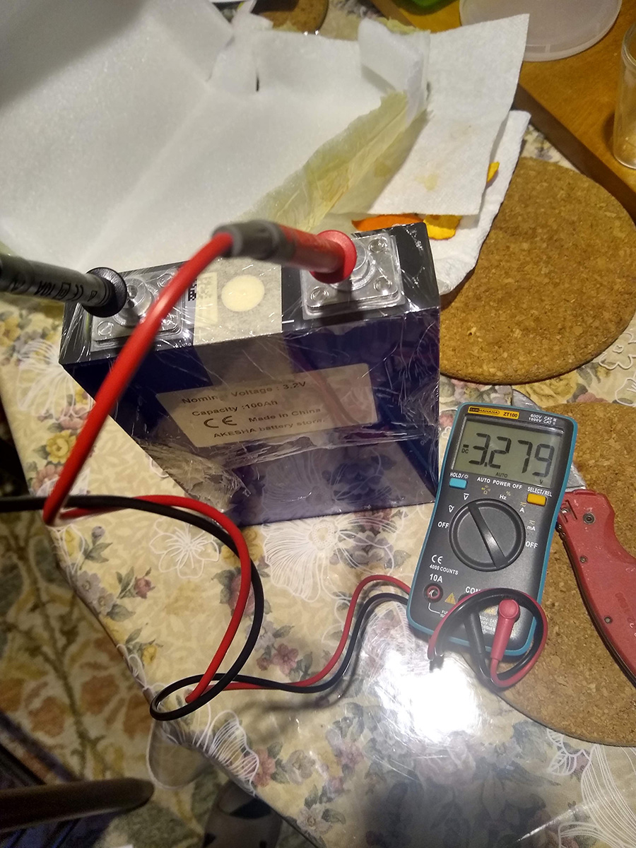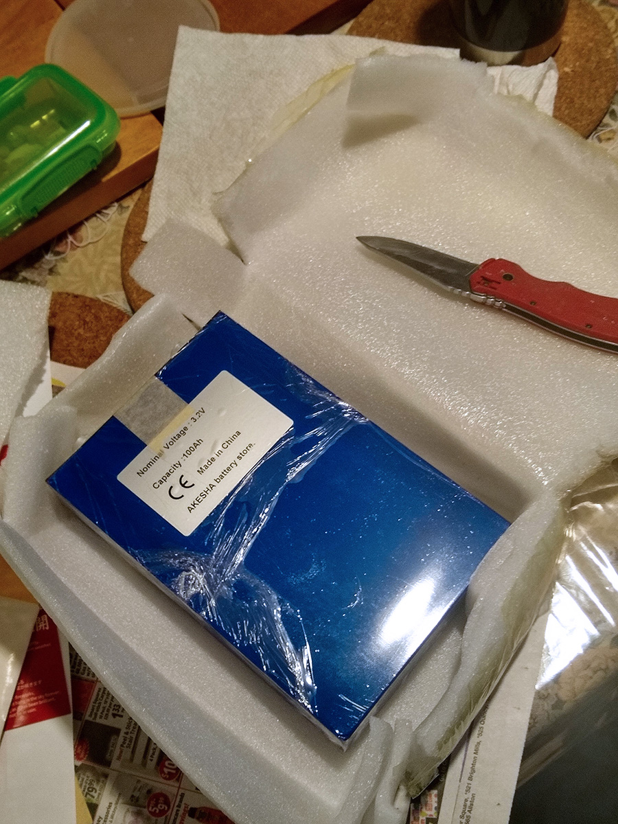when my father returned home i watched him open up the battery package. we bought 8x 100Ah 3.2V LiFeP04 cells for $253. they were bundled very well, each battery wrapped in a tight layer of foam packaging. with the encased batteries all over the dining table, it looked like bundles of drugs. my father only opened up one of the batteries, said they were brand new, in pristine condition, with plastic shrink wrap, no bulging whatsoever (unlike the stories we've heard from unlucky sellers buying from different china vendors). not sure how we snagged these bargain (almost too good to be true), the same seller now offers the same 8-piece deal for $446, a nearly $200 increase. we honestly thought they were going to cancel the order because it didn't make economical sense to ship something so cheap. but after 3 months, they finally came! my father tested battery: for something that's rated 3.2v, it still read 3.279v.