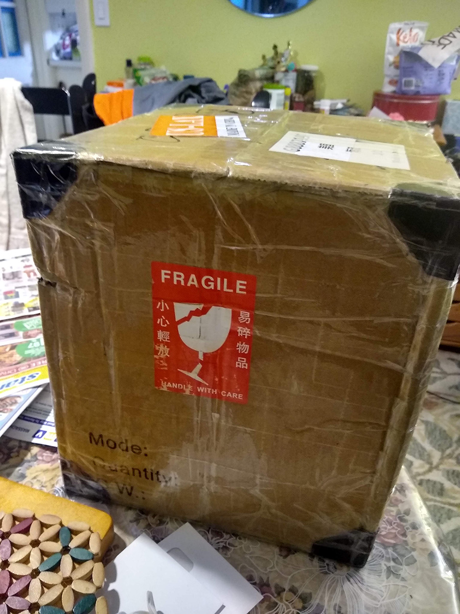 our aliexpress battery vendor informed me yesterday that our LiFeP04 batteries would be arriving today via fedex. when i checked the tracking number in the late morning, i was actually surprised to see it'd already arrived. checking the front door webcam confirmed that there was in fact a box sitting my parents' house's doorstep. it wouldn't be until later in the evening until my father could confirm the delivery.