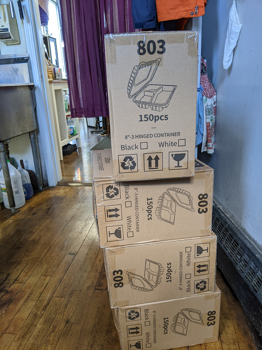 all day long there was the sound of construction in the parking lot. my sister got a contractor to build a small removable deck (with parquet flooring) in the back so people can do outdoor seating during the warmer months. it will take up at least one parking spot, if not more. i could see the sawdust wafting in the sunlight, so i closed the door (as much as i could without cutting off the electric cord).