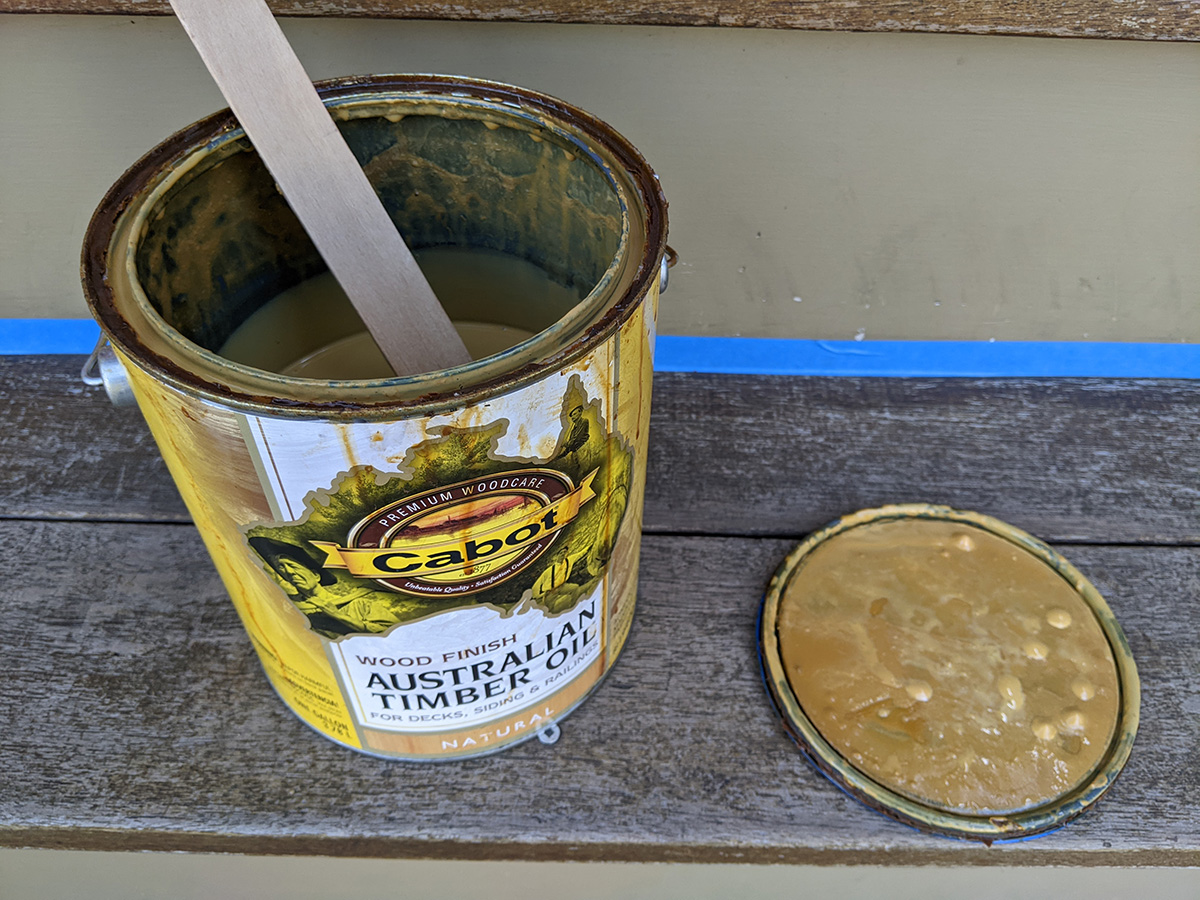first i had to tape, so i wouldn't get australian timber oil on the other surfaces. that took half an hour. that was followed by the oiling, which ended up taking 1-1/2 hours, as i applied the oil with a rag, meticulously rubbing the oil into the wood grain. i poured out just enough timber oil into a small disposable container, since i'd be dipping the dirty rag repeatedly into the oil. i also wore gloves. it wasn't too bad, the weather was in the upper 60's, and i got to chat with a few neighbors while i worked, including neil and renee.