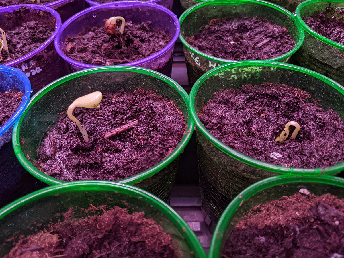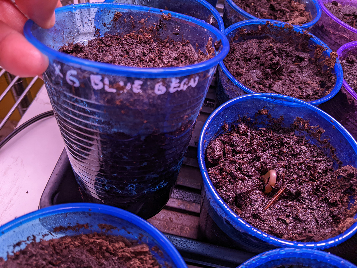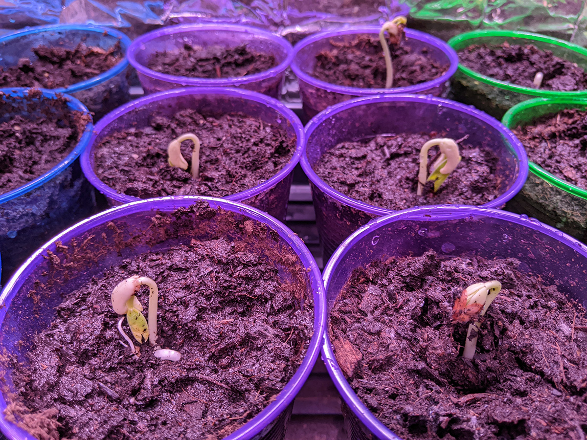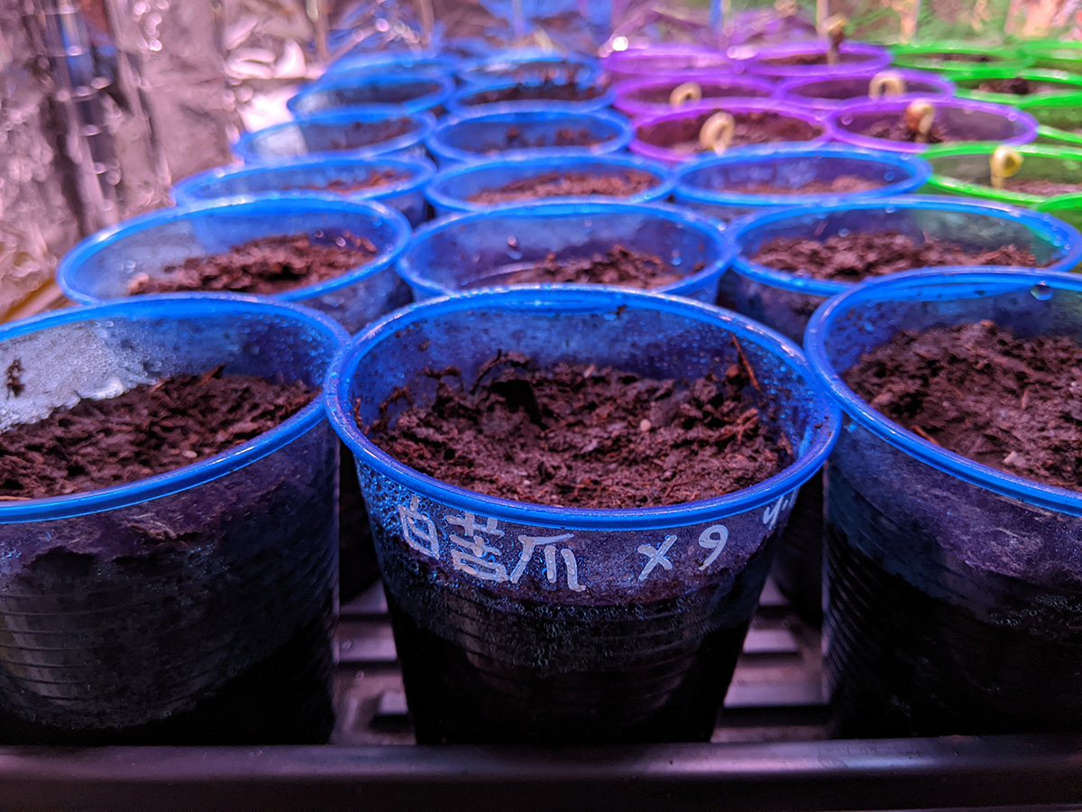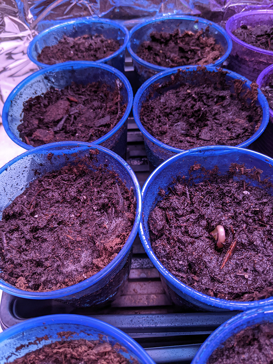 while watering the plants in my grow closet, i noticed some new sprouts from the second batch of seeds i planted on tuesday night. so it didn't take long to germinate, not even 4 full days - thanks to the heat mats. 5 out of 6 long beans had sprouted. 2 of 9 buttercup squashes. none of the bitter melons yet. 1 of 6 blue beans. and 1 of 6 hyacinth beans. i remember last year i had a particular hard time germinating hyacinth beans, they would simply rot before they sprouted, until i started using the heat mats.