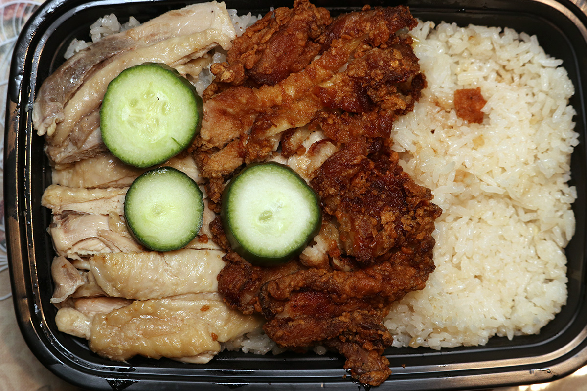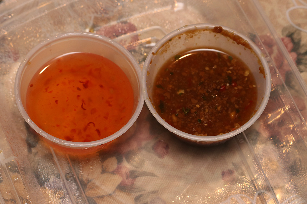 this was my first time eating thai chicken rice ever since my mother left for taiwan, but my father had already ordered it for dinner at least one time by himself. i got the roasted chicken while my father got the combo. honestly, i could care less about what flavor of chicken, i just love the hot sauce it comes with, it's pretty amazing.