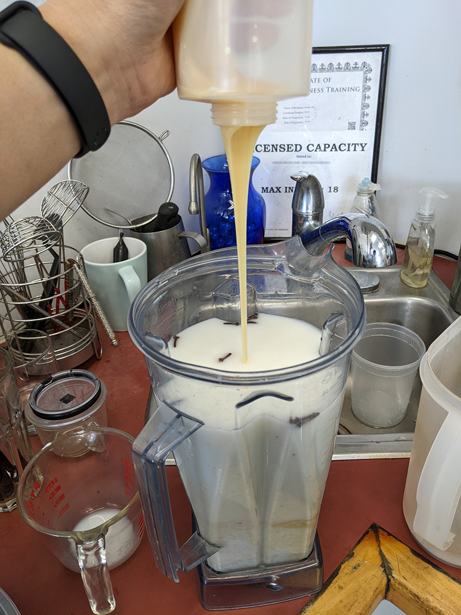 so i made some horchata. i've been wanting to make horchata for over a year now, ever since i discovered it watching some television show where one of the character talks about spilling his horchata. horchata? so i looked it up, and discovered it's a sweet mexican drink composed of blended milk and rice. the easiest way to make it is to use a vitamix blender, which would blend everything, no straining involved. so it was a recipe that can only be done at the cafe, where we have a vitamix blender. it's also a two day affair, where you soak the rice overnight, then blend all the ingredients the next day. my father gave me some blending tips, i was sort of afraid of the power of the vitamix. he said to mix in two batches, and just maximum power. at first it kept making a horrible grinding sound as it was trying to pulverize the rice and cinnamon sticks, but after about a minute on high power, everything combined into a smooth consistency.