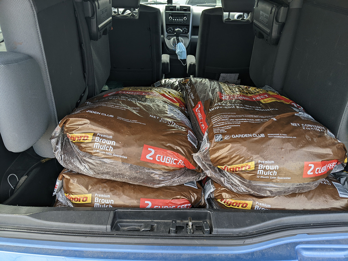 3pm i took the car to home depot to buy 10 bags of vigoro brown mulch (2 cu.ft per bag) which were on sale for $2 a bag. it's for the mulch bed around the parking lot, but i don't think 10 bags is enough. i was worried the car couldn't support all that weight from the bags of mulch. i stopped by my parents' house to grab a few things - my drone, laser measuring tool, baby cucumbers, garden gloves - before returning to the cafe. i was going to start mulching, but my father said it could wait until tomorrow.