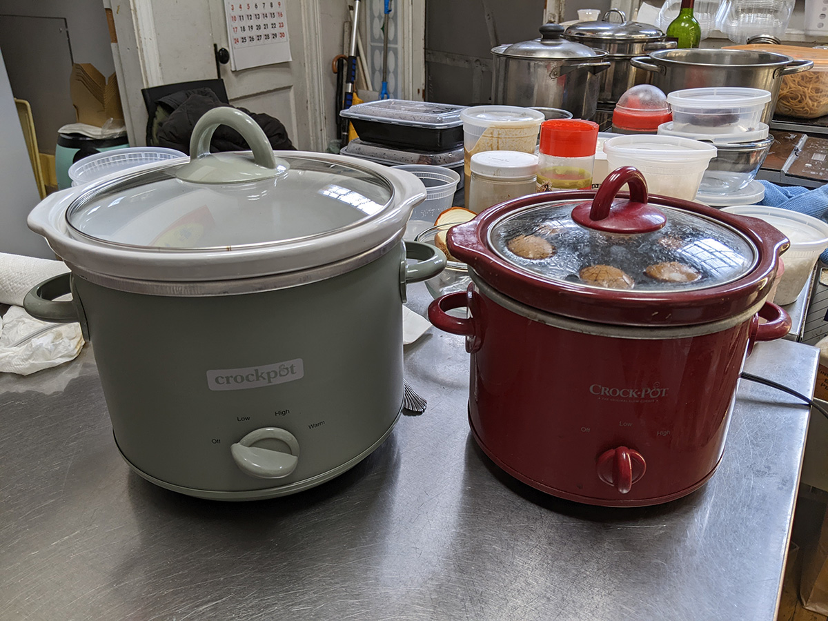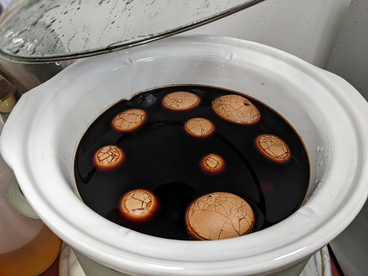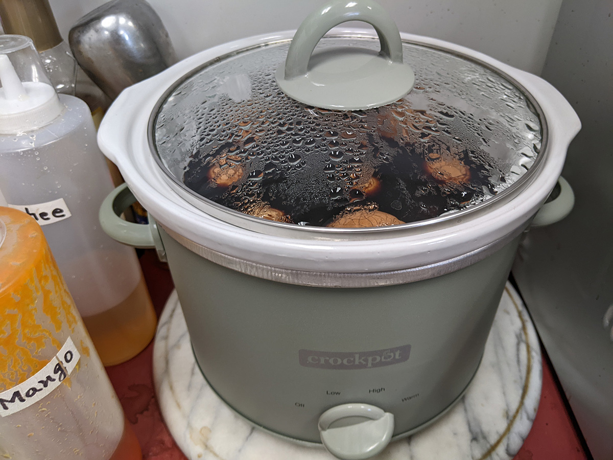 the tea egg making system we use now needs to be overhauled. i'm basically making tea eggs every day because they sell just as fast as i'm able to make them. every bento box has a tea egg, not to mention of a customer wants to buy them directly. the issue is tea eggs taste better when they have a change to marinate in the tea brine longer, but they're being sold so fast, we're pretty much selling the ones i made the day before. with a larger crockpot, we can cook more tea eggs, so hopefully i only need to make them every few days instead of daily.