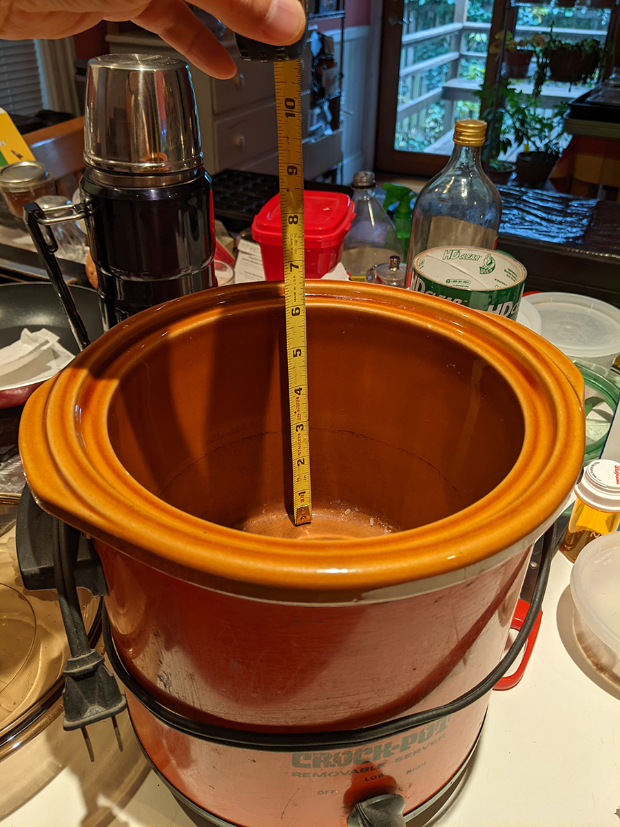 i returned to the cafe to try out the new 3qt crockpot. i transferred over the content of the 2qt crockpot into the new larger crockpot. it was still small enough that it could fit in its old spot. the porcelain bowl in the 3qt is white (the 2qt was red), which makes it easier to see how much brine is left in the pot. at last count there was 15 tea eggs, but i could fit a dozen more eggs. i was curious about the keep warm function. the smart plug told me it used 62W, while the old crockpot - which only had low/high and we kept it on low - was 76W. on the new crockpot, low uses 112W, while high is 173W.