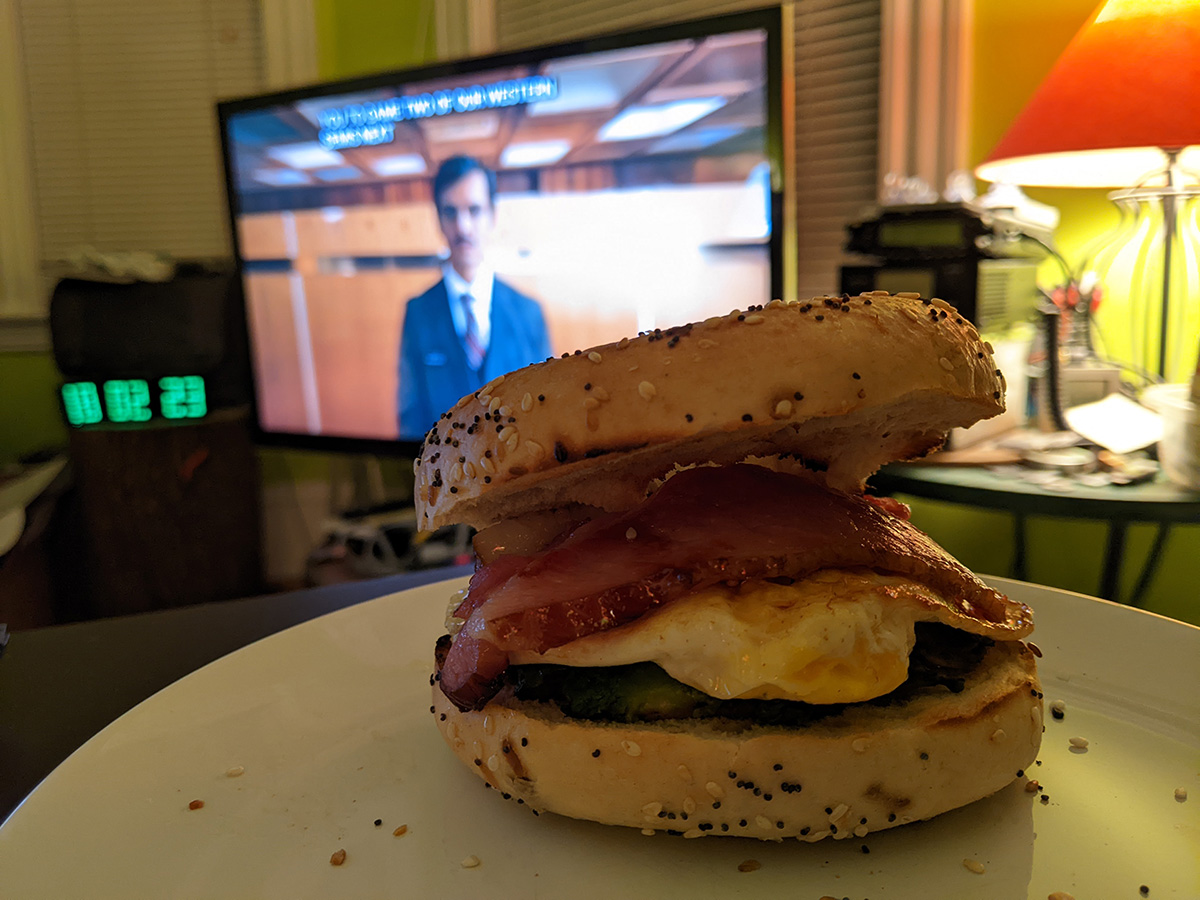 i finally left the cafe around 4:30pm, during another lull in the rain. i walked to star market to pick up some mangoes on sale. i didn't eat all day and had an instant cup of korean shin black noodles for a late lunch. later in the evening (9pm) i finished off my leftover holiday ham and avocado half by making a bagel sandwich for dinner.