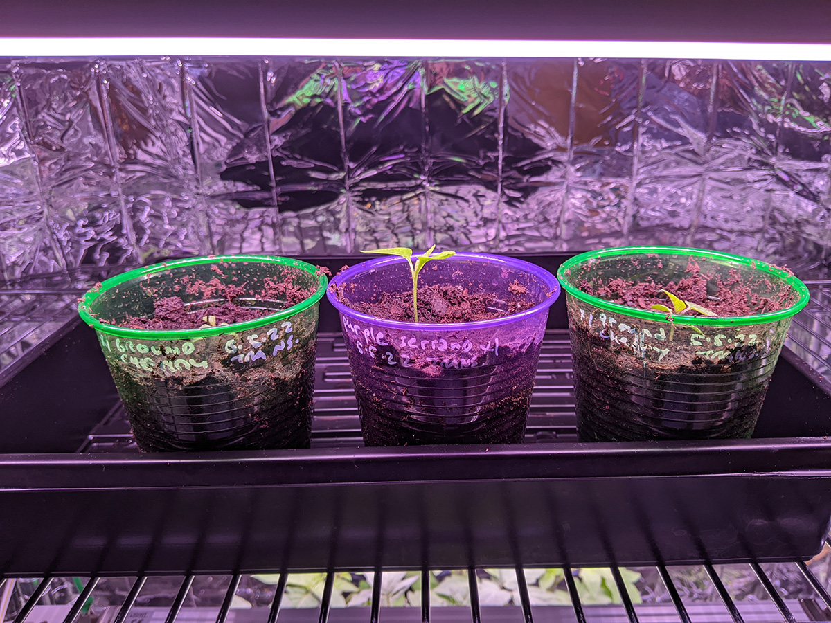 temperature was in the 60's this morning, warm enough to just go out in a shirt with rolled up sleeves. i set up a single strip led on my topmost grow closet shelf so it was illuminate 3 transplanted vegetables (2 ground cherries, 1 purple serrano pepper). i also moved the two trays of seeds i started last night into the kitchen, along with the heat mat. if memory serves me correctly, they should start germinating (with heating assistance) in about 5 days time, though the bitter melons do take a bit longer.