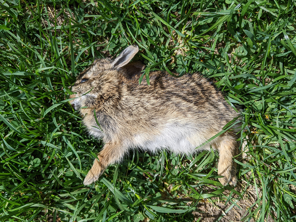 while doing a cursory inspection of the backyard and garden, i saw a dead bunny on the lawn. this is the second bunny to have died. there didn't seem to be any foul play (body was still intact, no wounds),